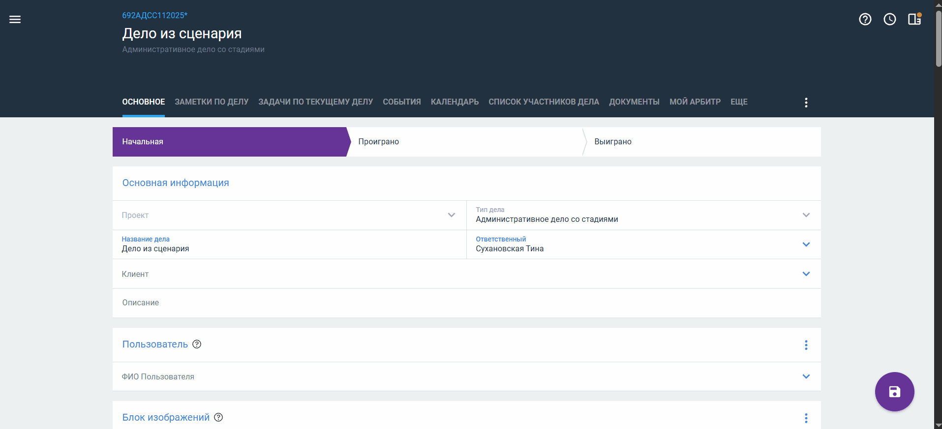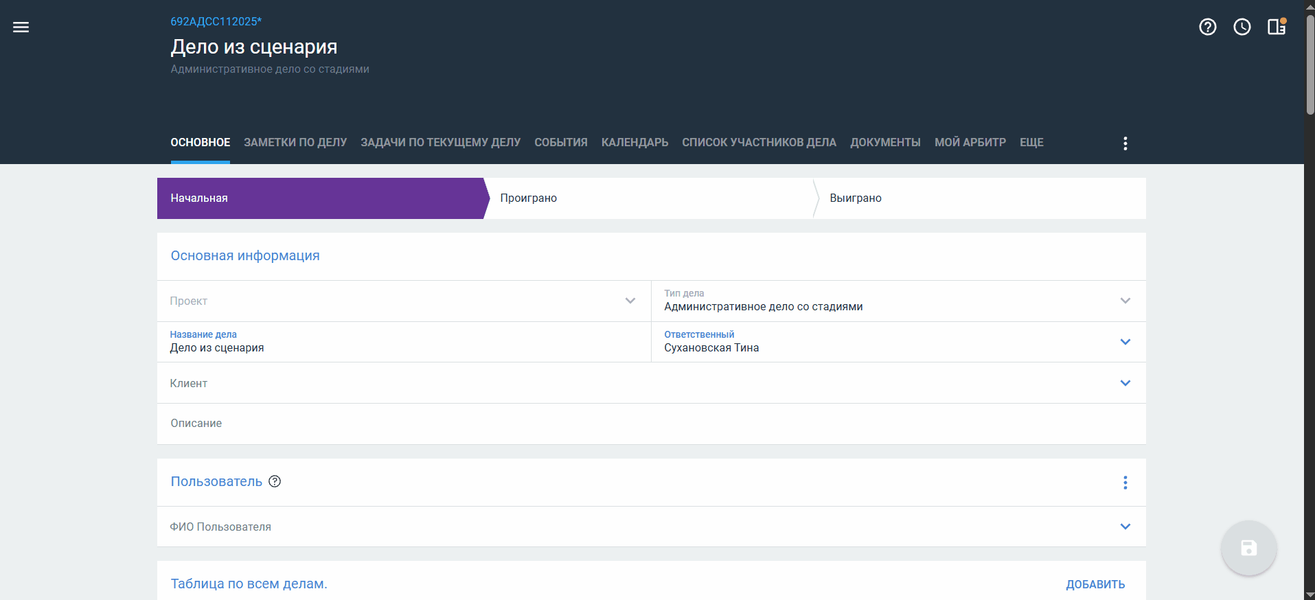 - Сохраните карточку объекта/дела.