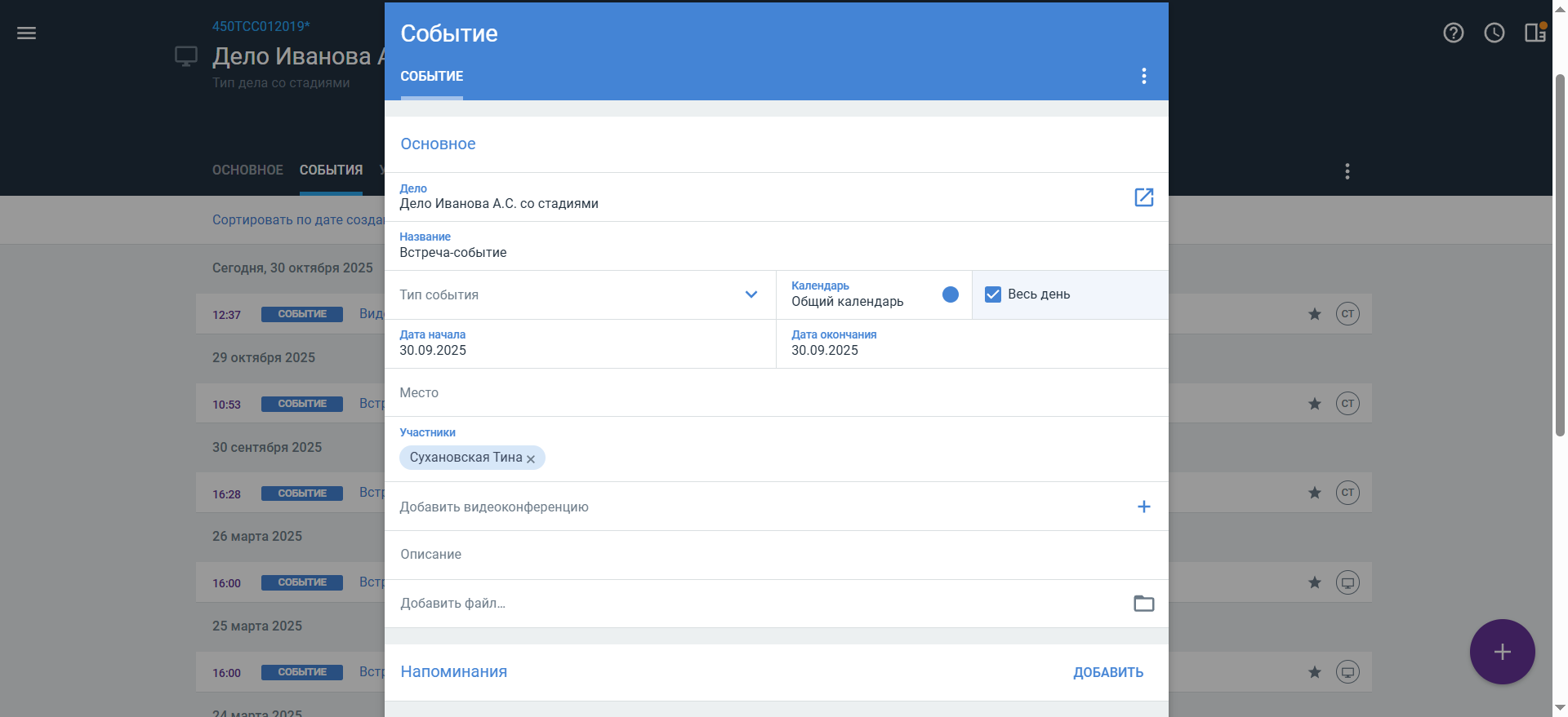 - Тип события, например: Встреча, Задача, Жалоба и т.д.
