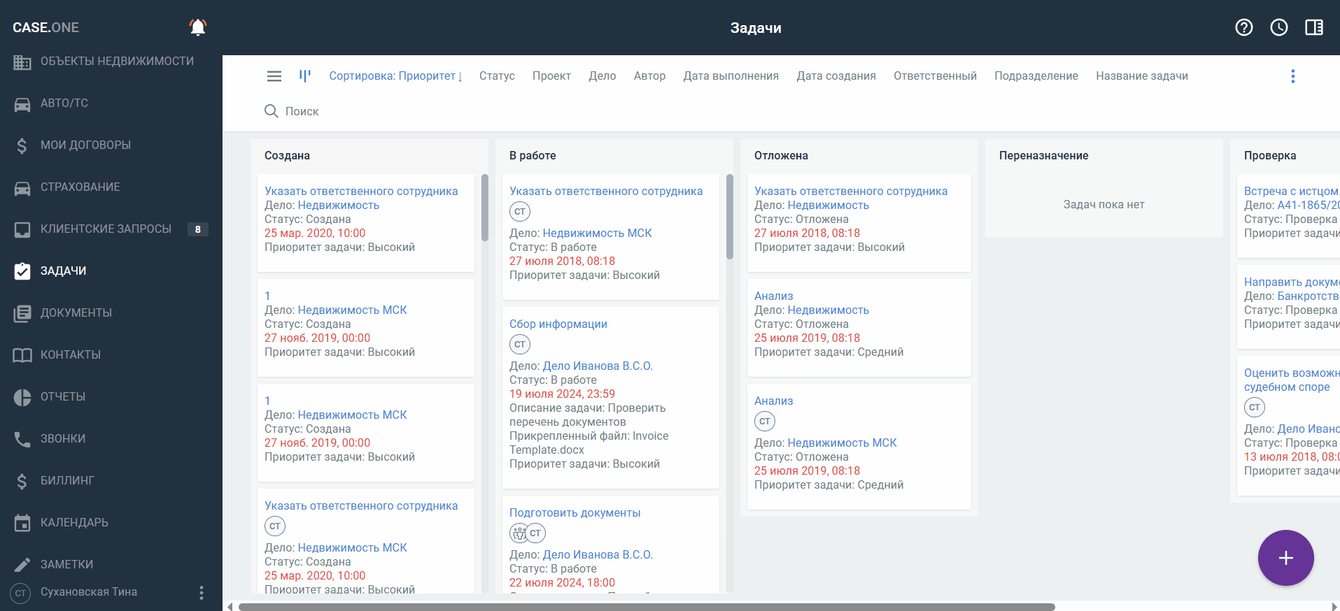 в правом нижнем углу. - В карточке дела или объекта — перейдите на вкладку Задачи и нажмите кнопку