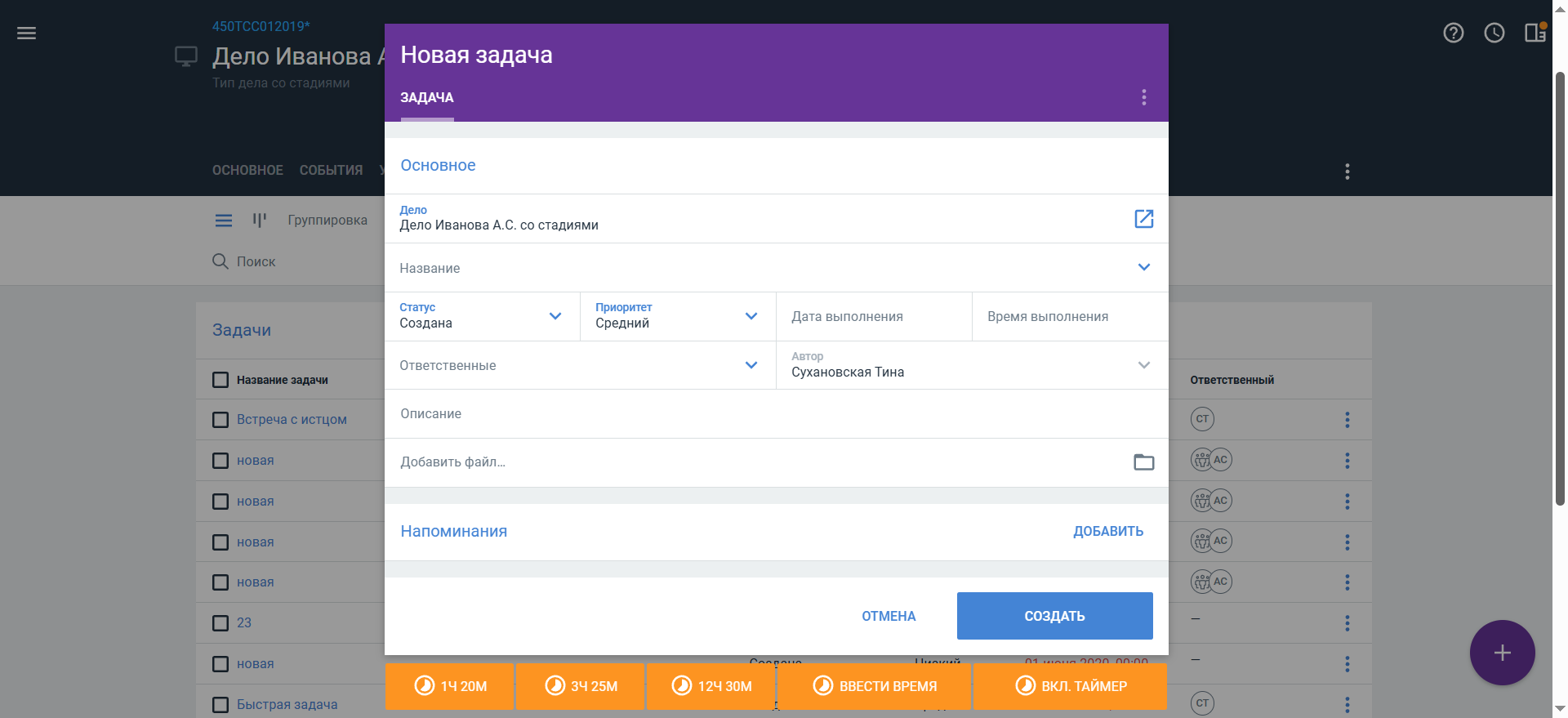 Обязательным для задачи является ее название и название дела или объекта, в рамках которого ведется задача. Если вы создаете задачу из карточки дела название дела будет определено автоматически.