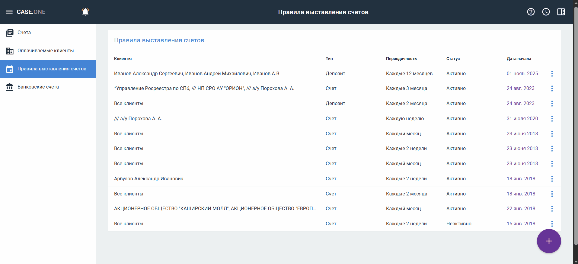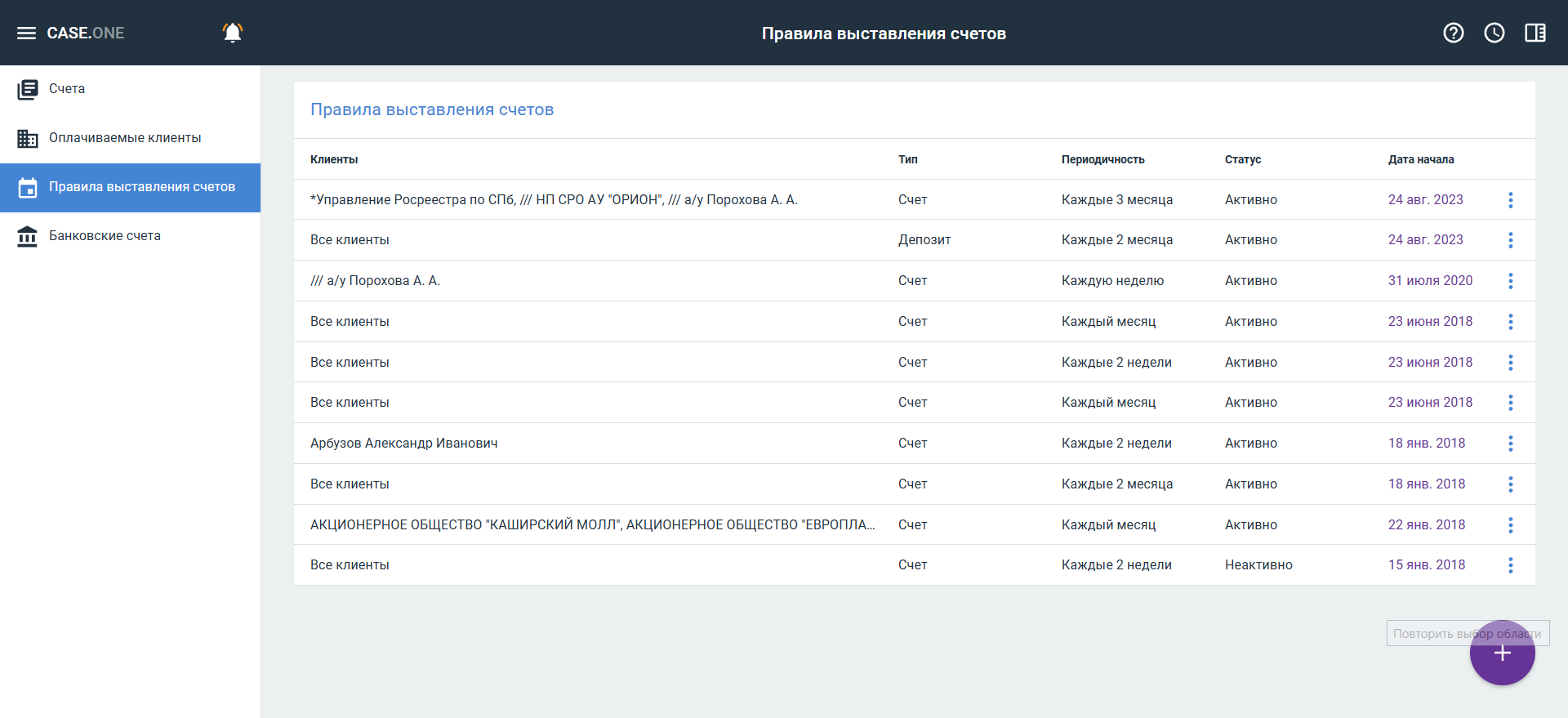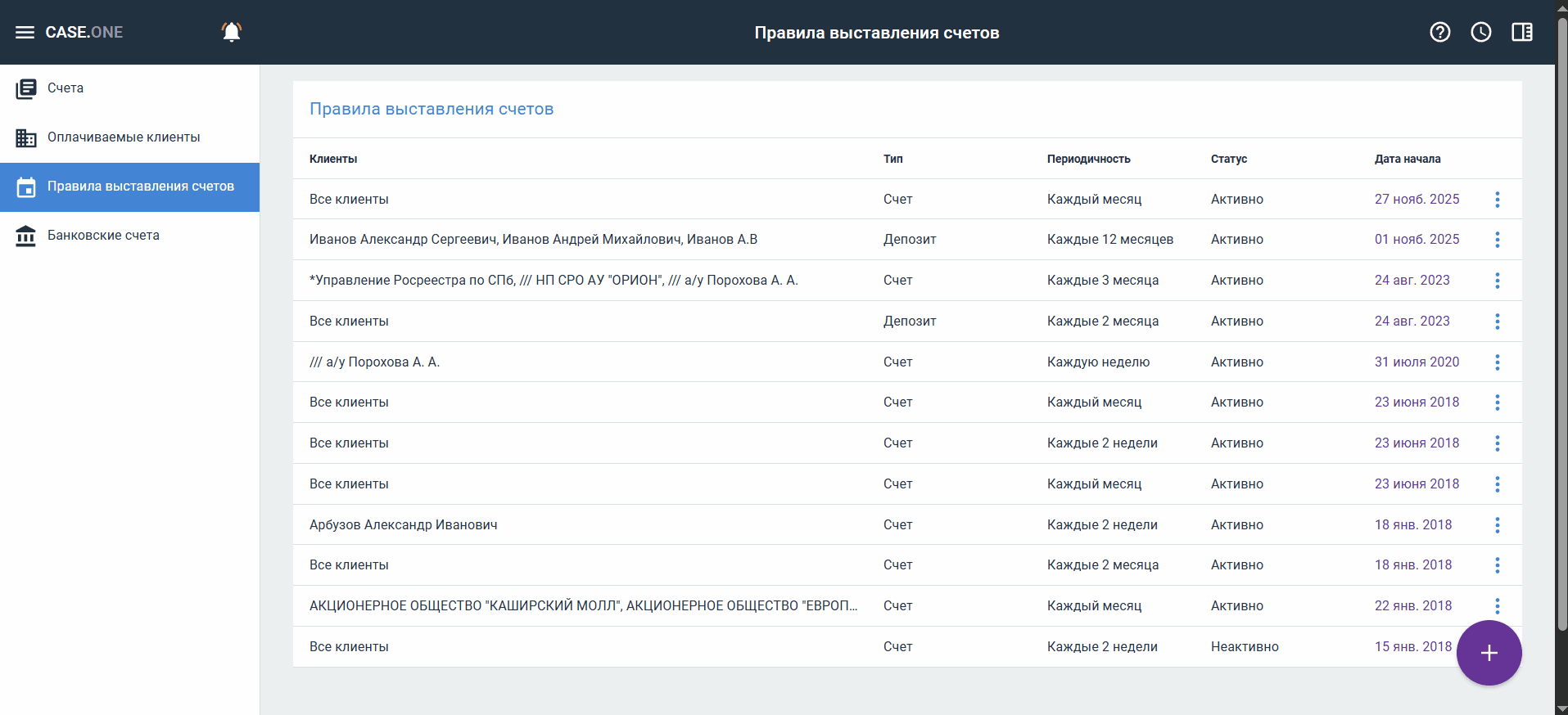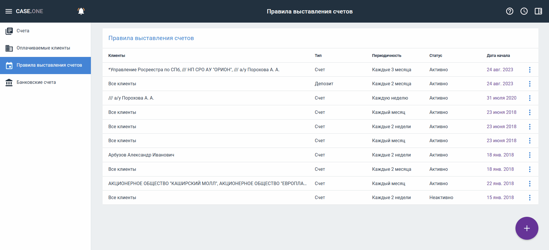 Вы можете создавать и настраивать правила для автоматического создания и отправки счетов и депозитов по расписанию. Создавать можно неограниченное количество правил.