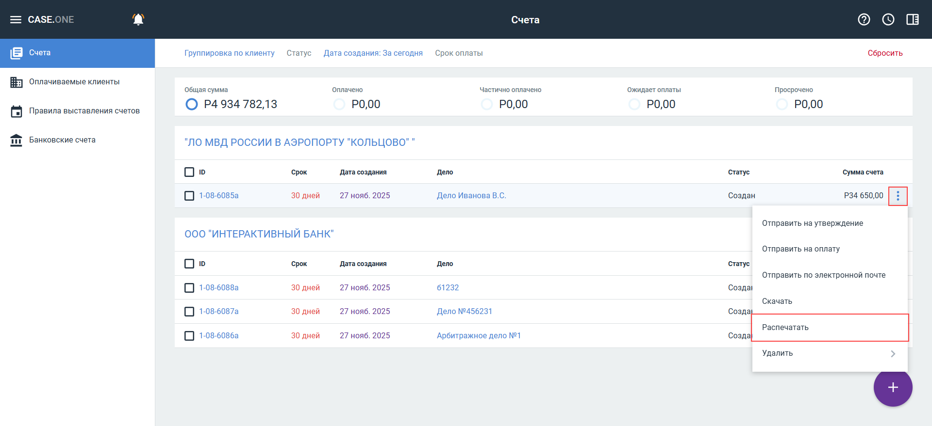 Счет или несколько счетов можно распечатать из списка счетов и из карточки счета.