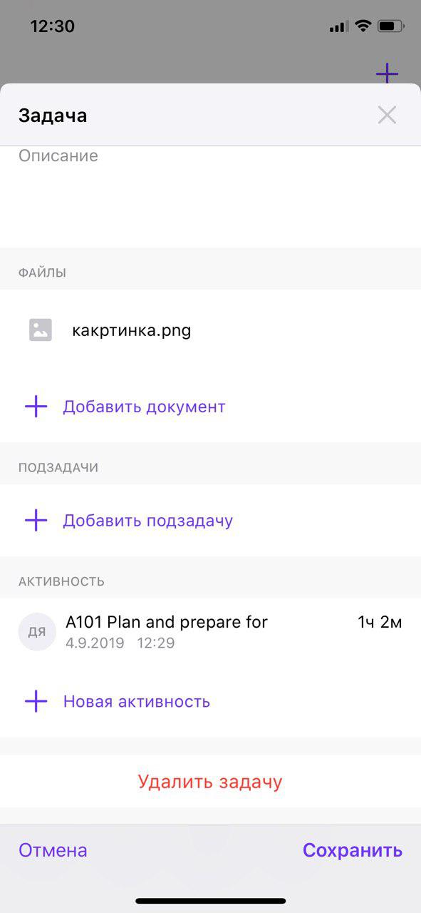 - Добавьте при необходимости документы, подзадачи, активность, нажав кнопку