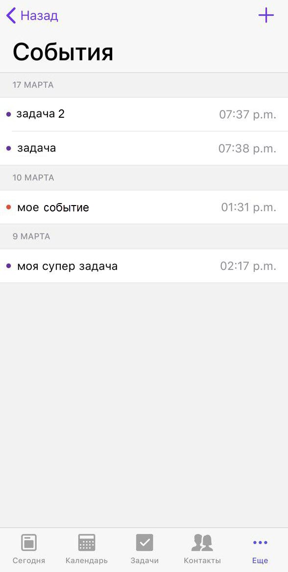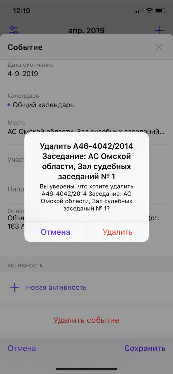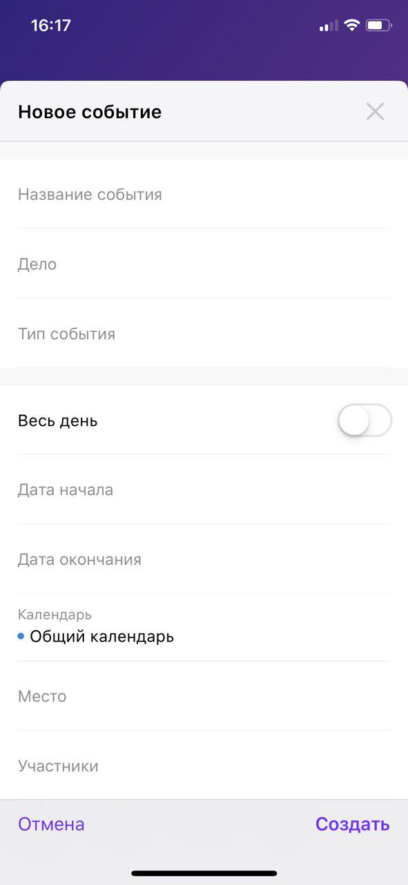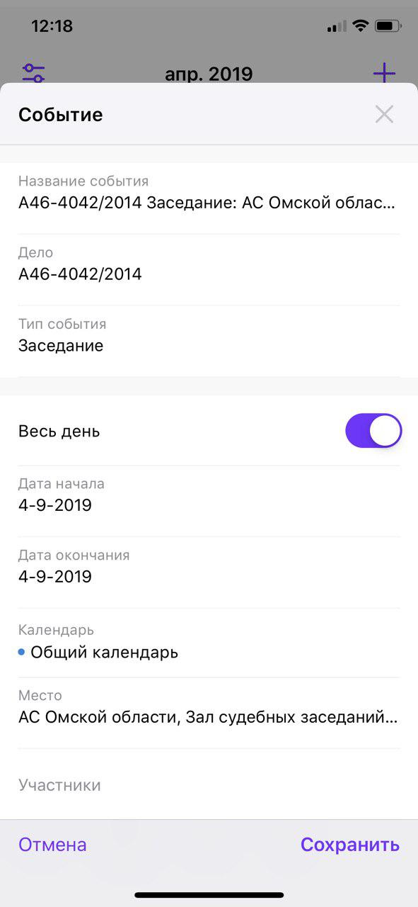 - Укажите тип события, дело, к которому относится событие, место, дату и время начала и окончания