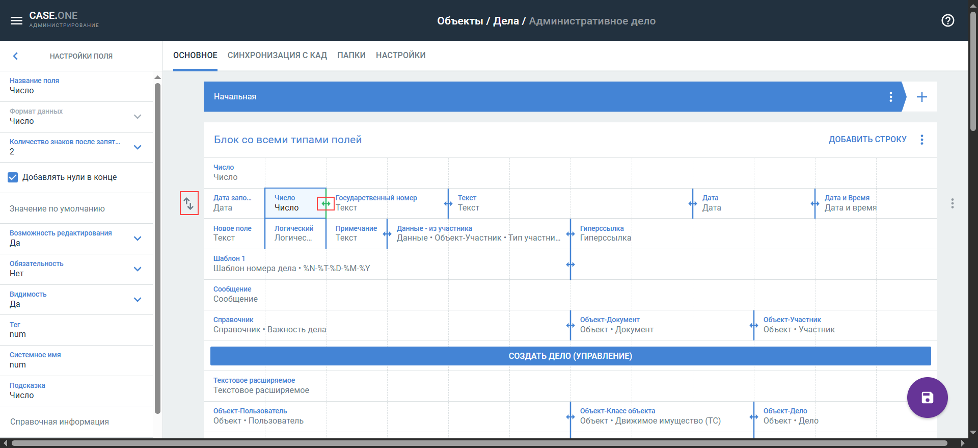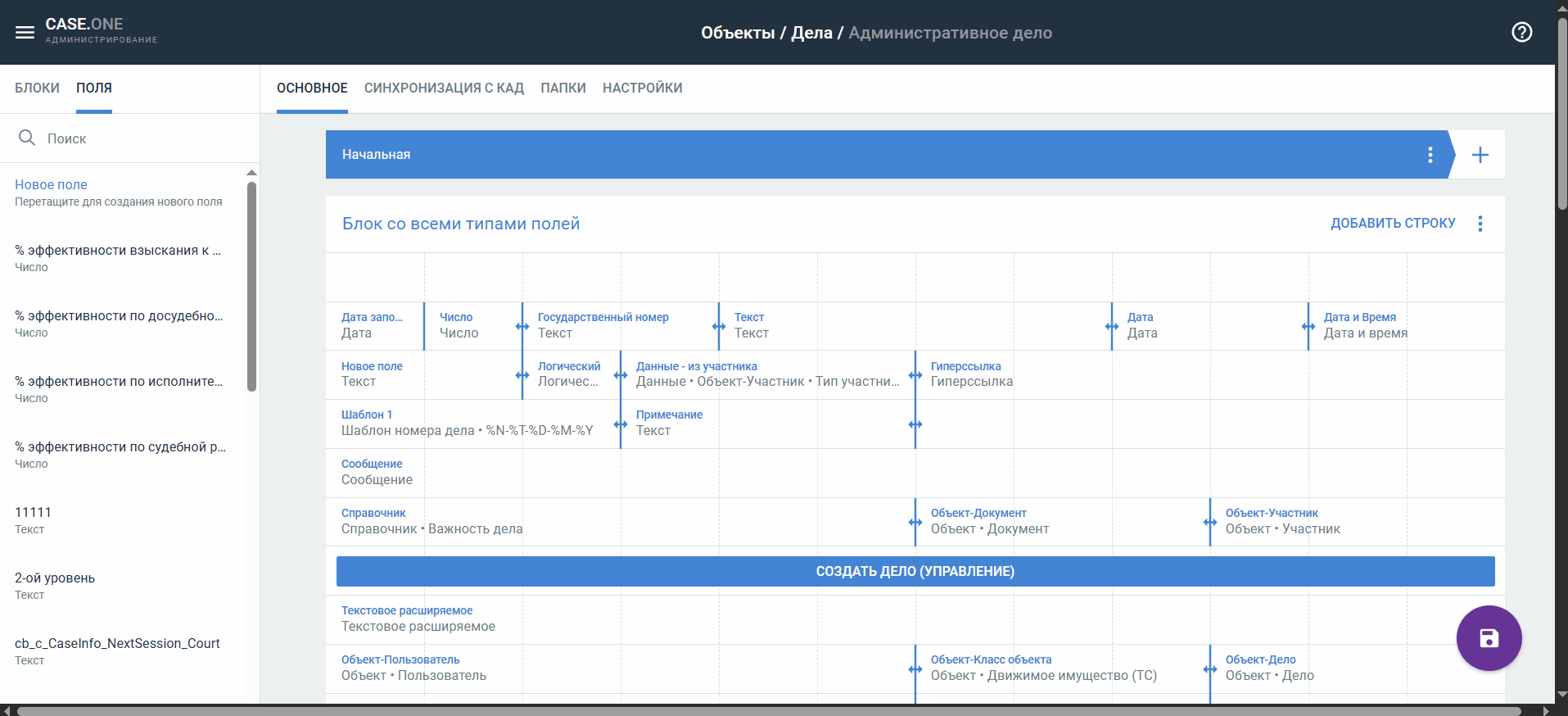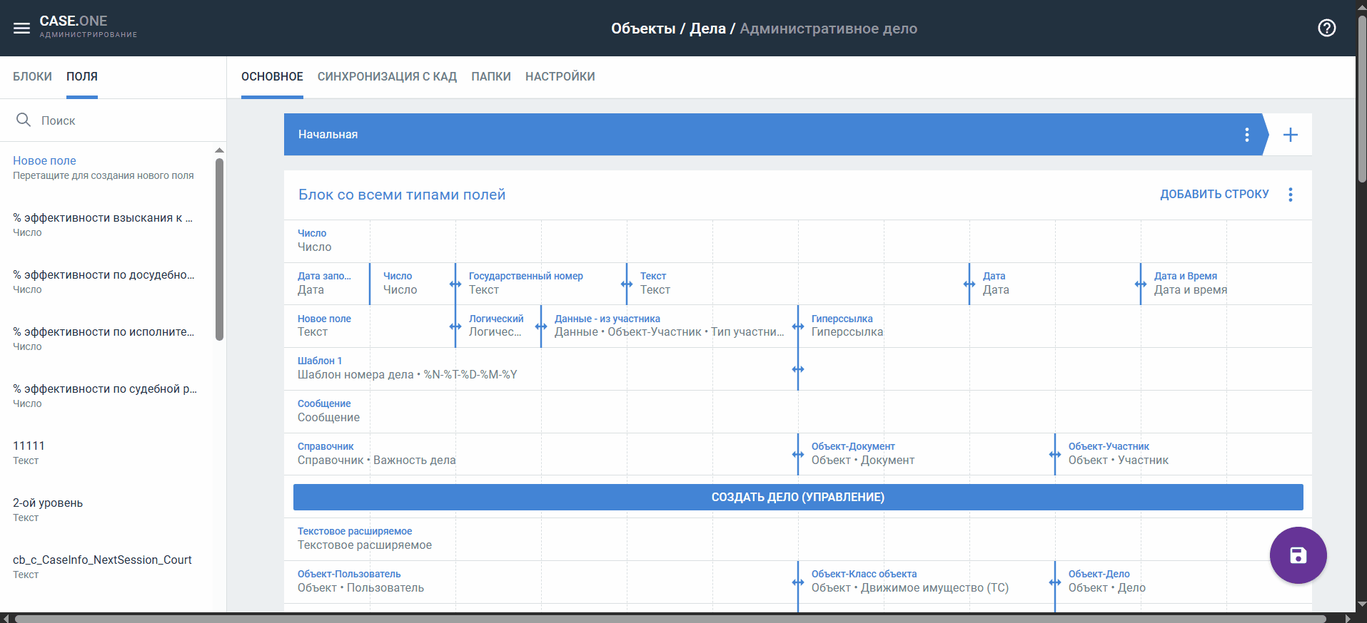 Какие типы поле есть? Как настроить формат поля? Чем отличаются разные типы полей? Как создать поле? Какие настройки есть у поля? Какие настройки поля нужно указать для синхронизации с КАД? Какие настройки поля нужно указать для формирования документов?