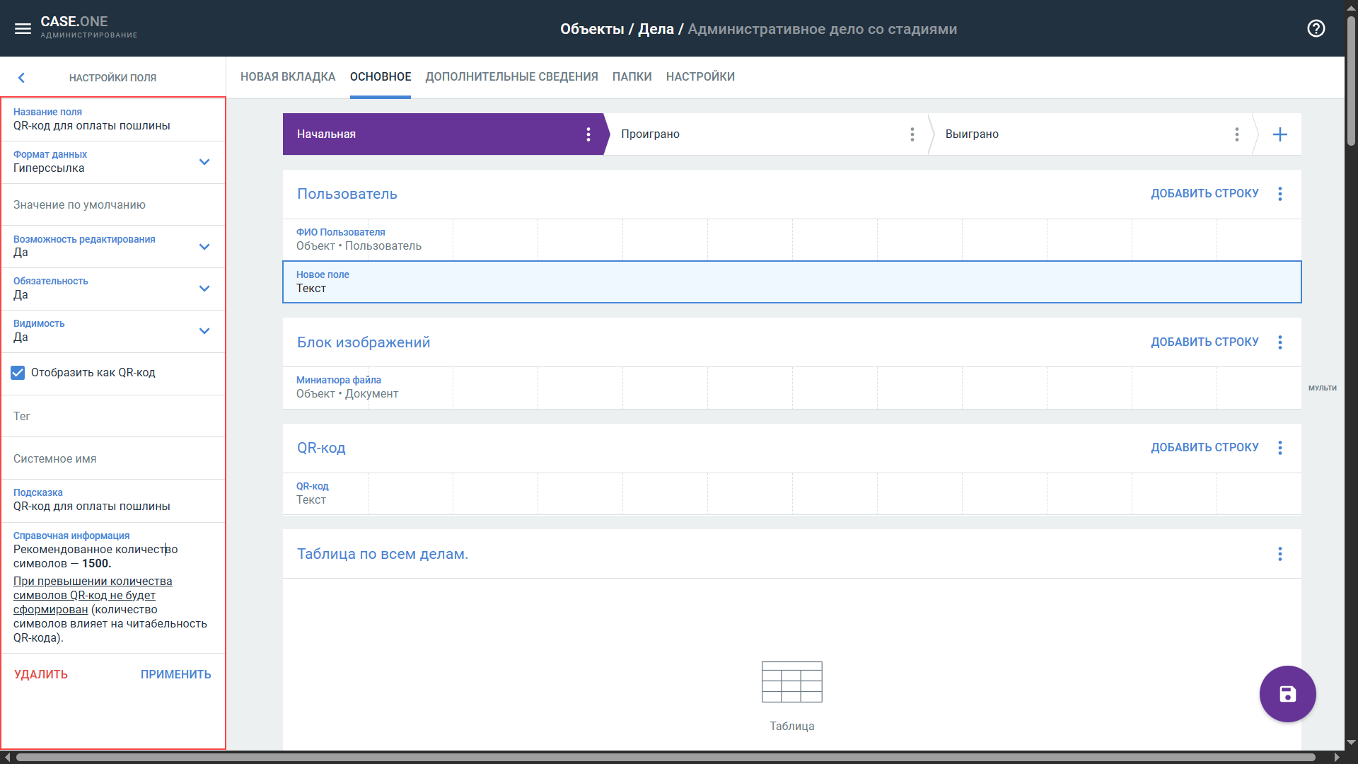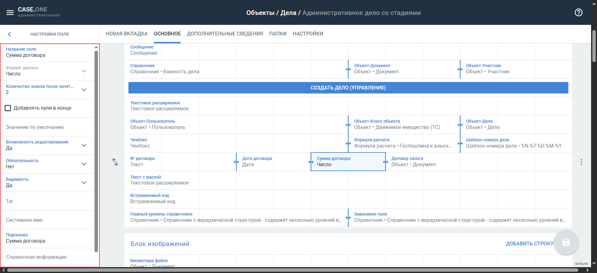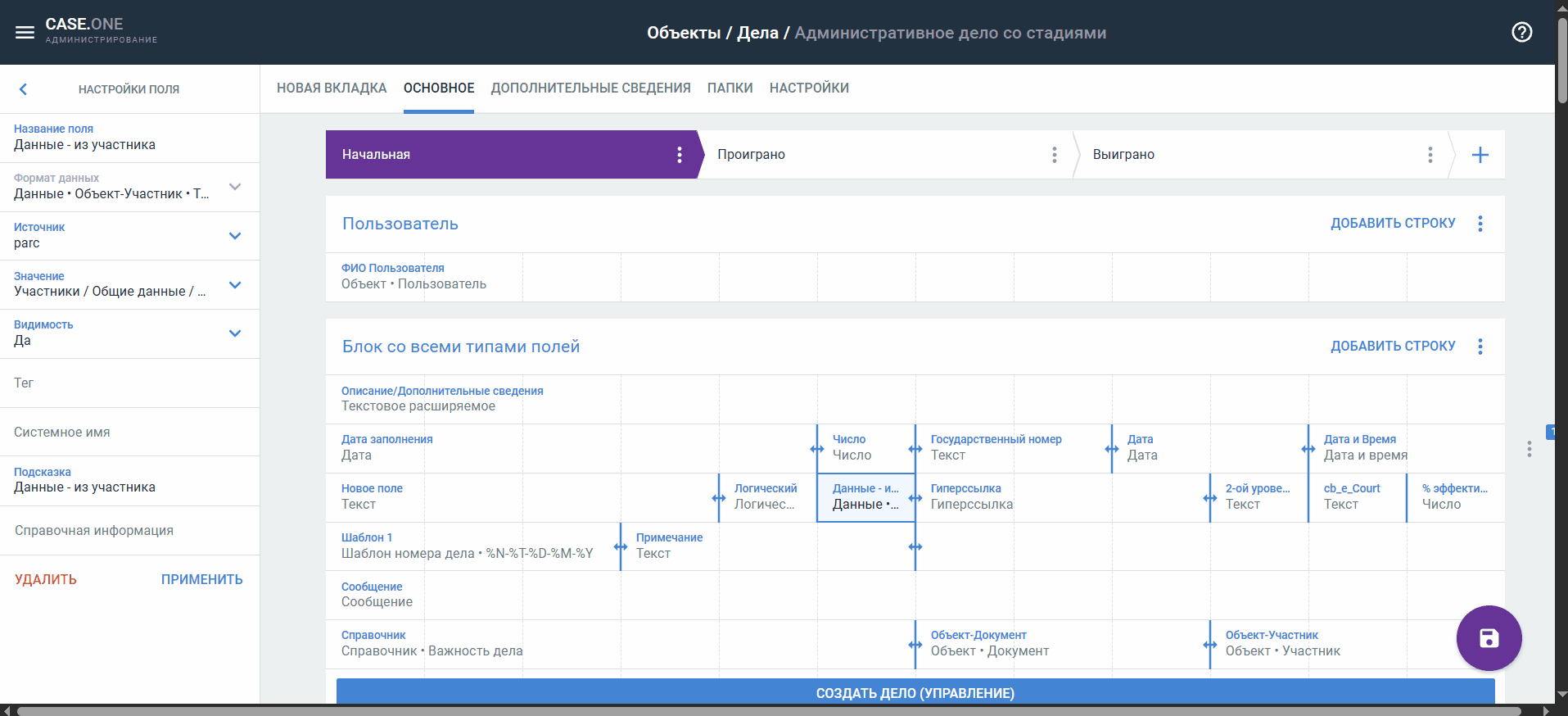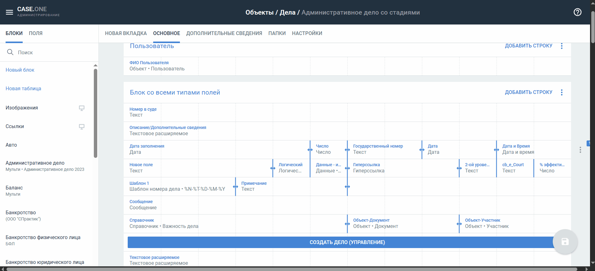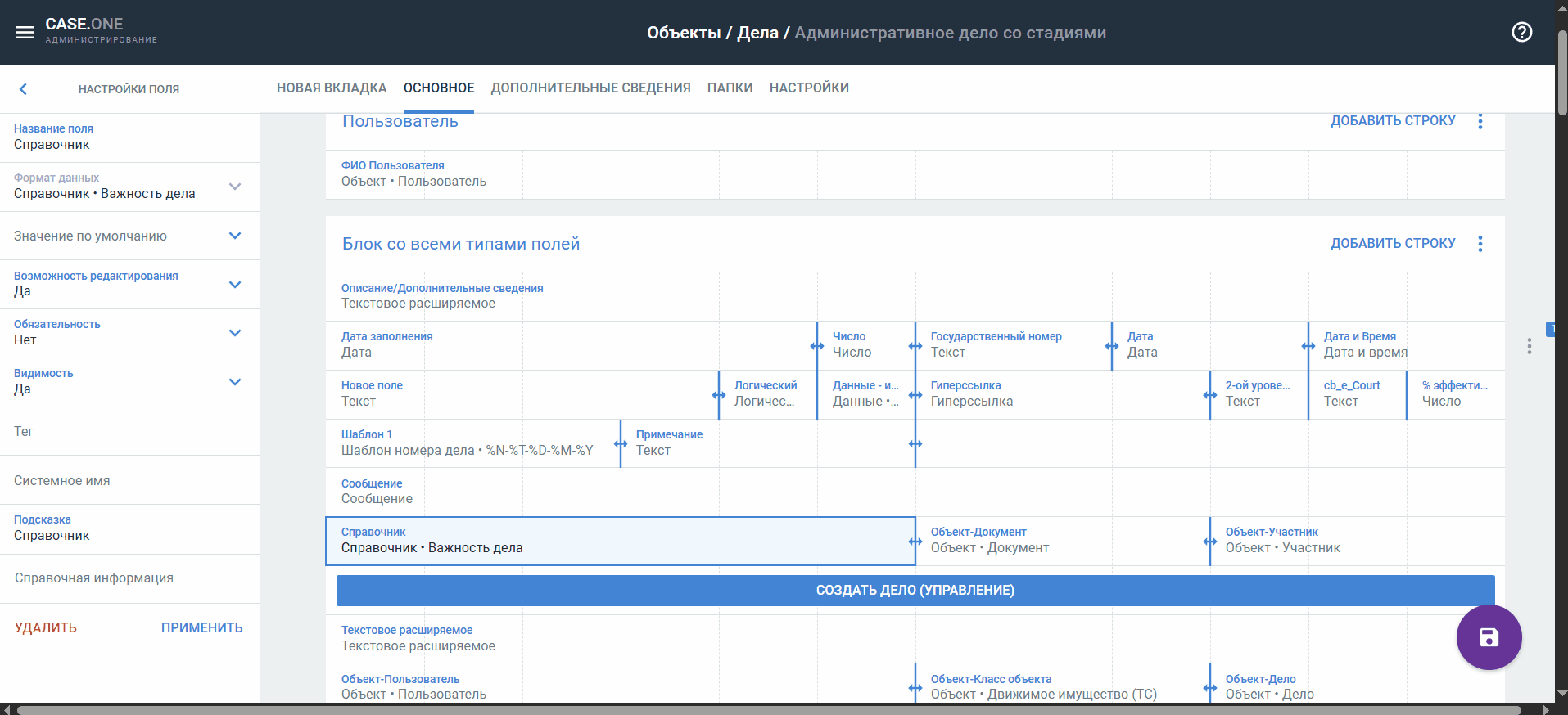 Если вы внесете изменения в готовый блок или отредактируете параметры полей, при сохранении эти настройки будут применены ко всем полям и блокам во всех типах объектов и самих карточках дел, где они используются.