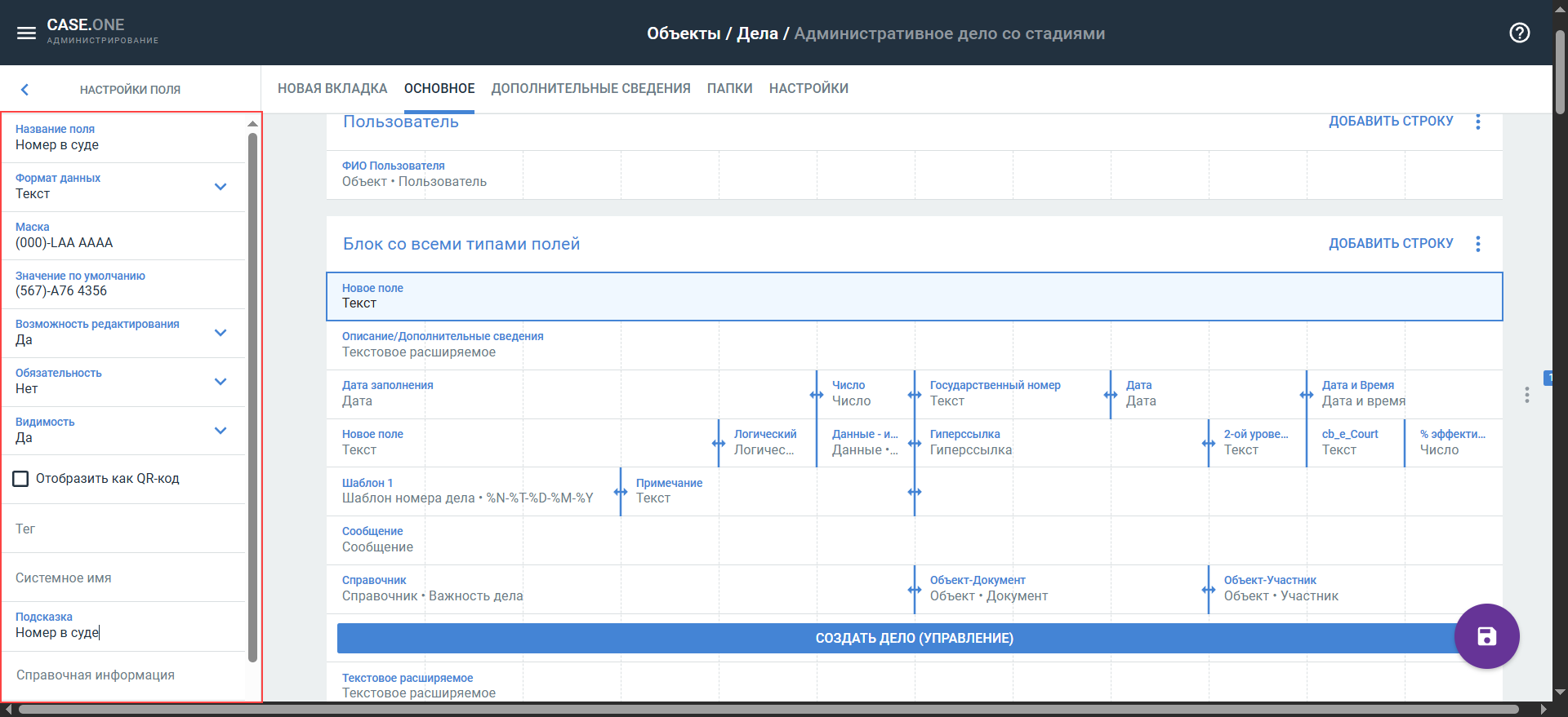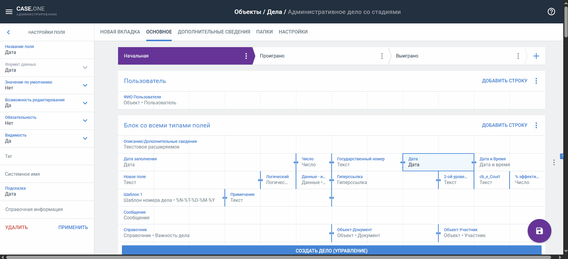 - Значение по умолчанию — можно указать значение, которое будет заполнено по умолчанию в карточке объекта/дела.