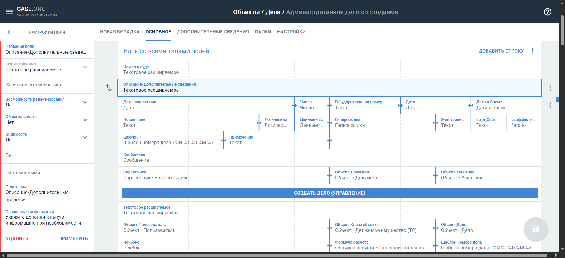 - Объект-Дело и Объект-Объект — поле позволяет вставлять ссылку на объект/дело в Case.one