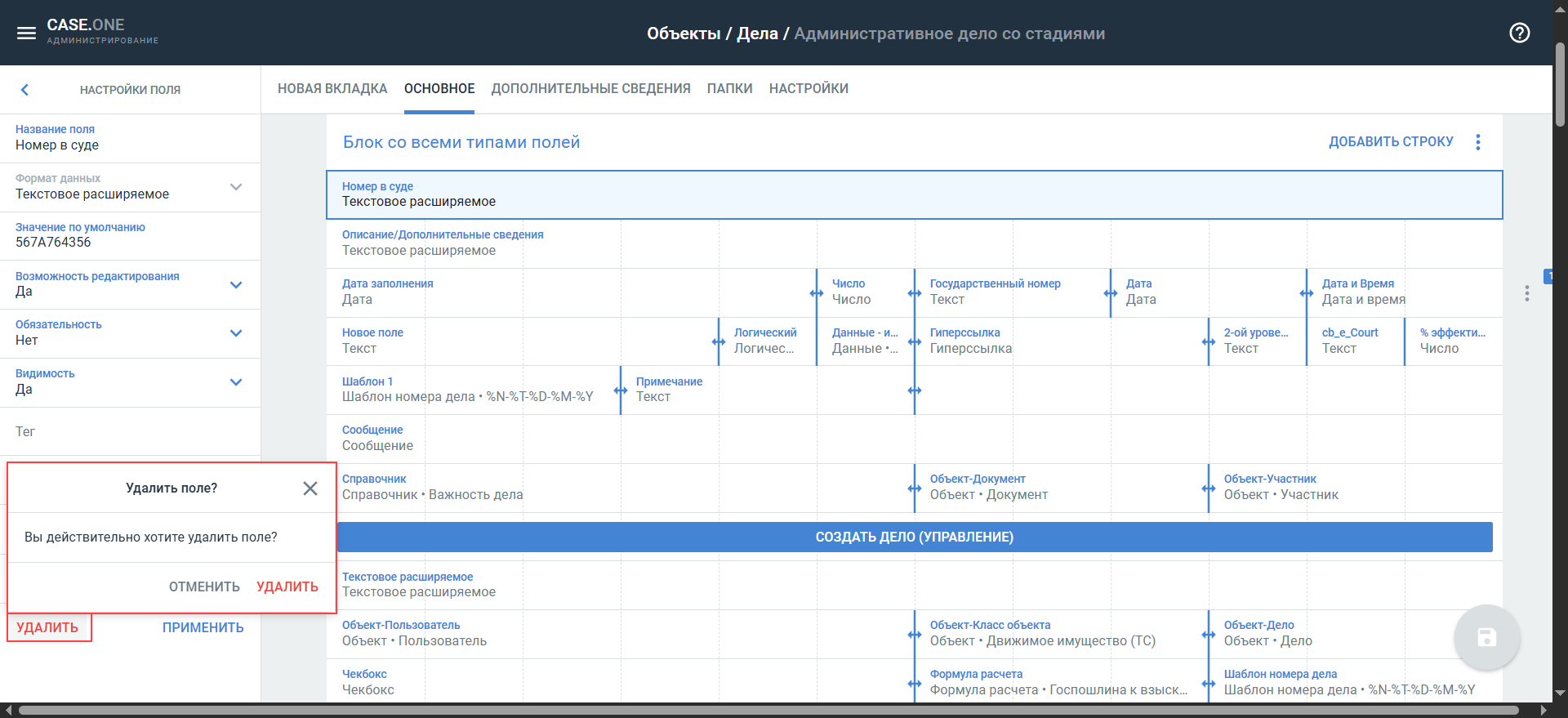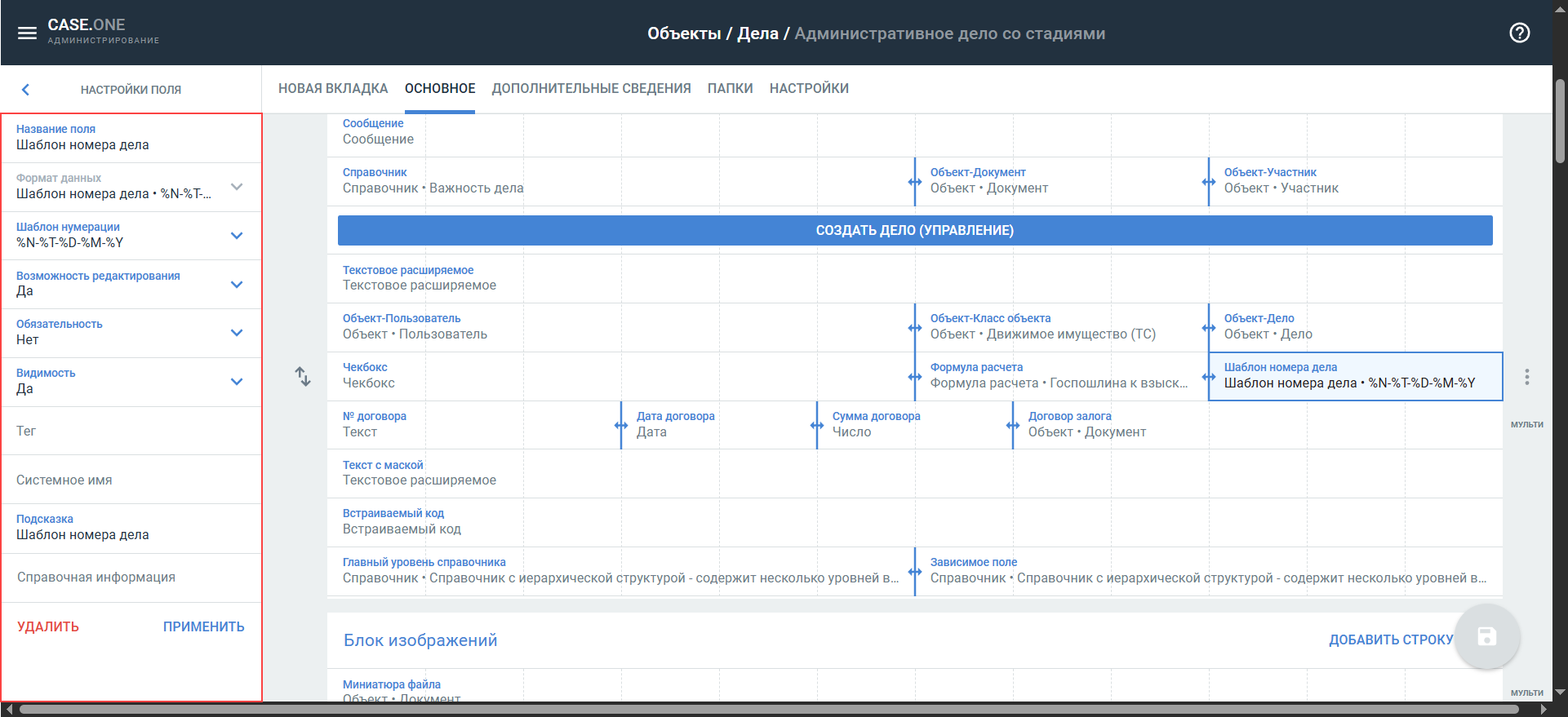 - Шаблон номера дела — в поле можно выбрать шаблон нумерации дел/объектов.
