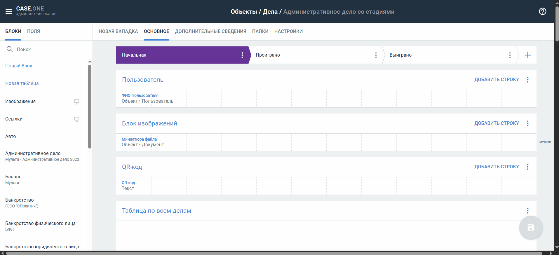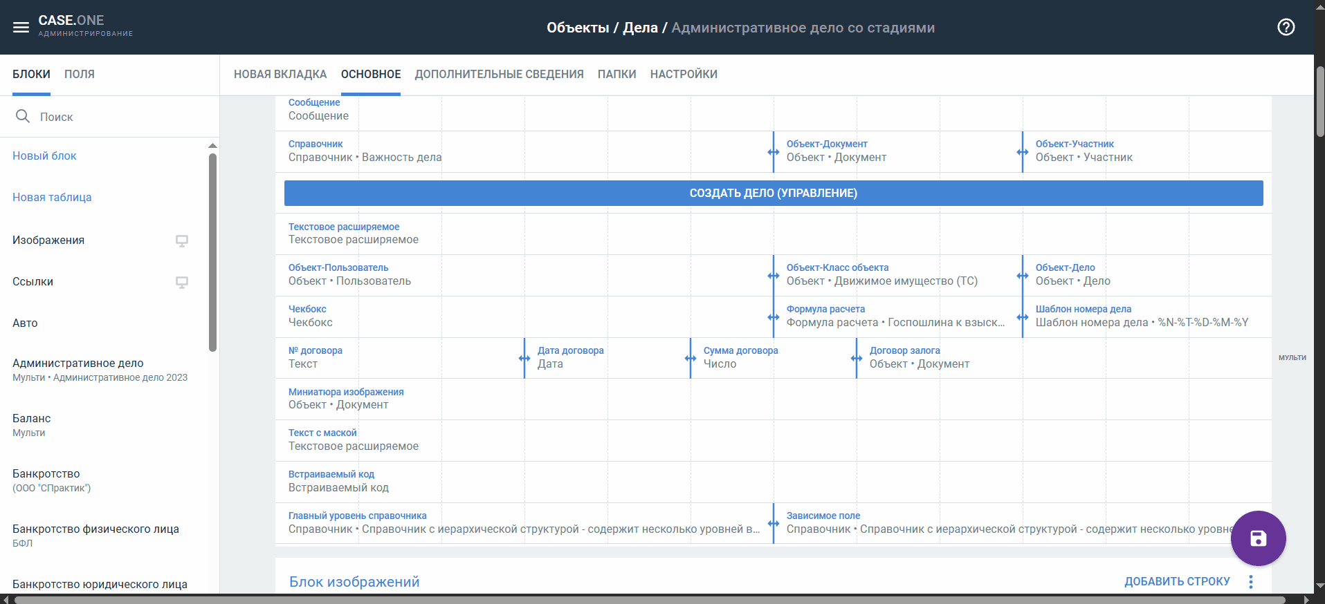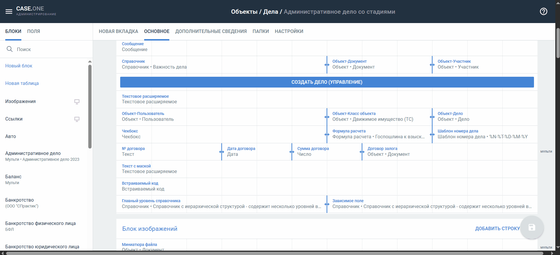 - В списке блоков отображаются все блоки всех типов дел выбранного объекта