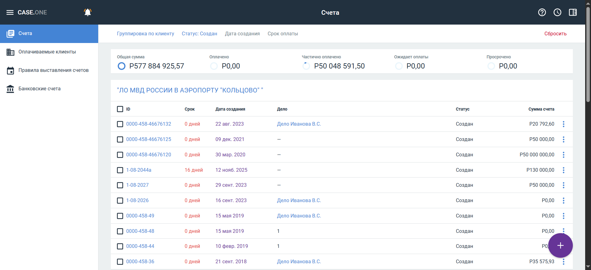 - Управлять счетами: создавать счет или сразу несколько счетов, изменять статусы счета, редактировать информацию по счетам и т.д.