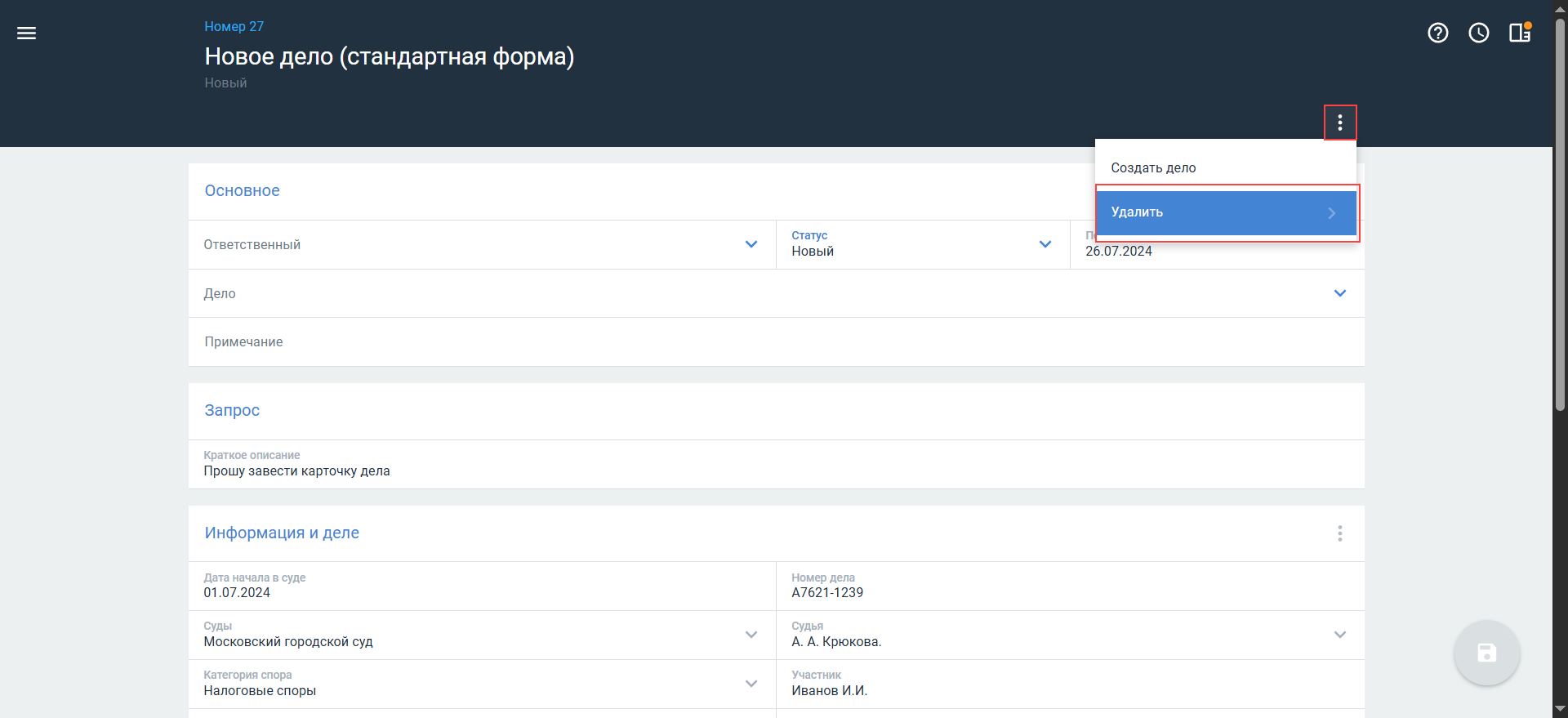 Удалить клиентский запрос можно и при просмотре карточки запроса: