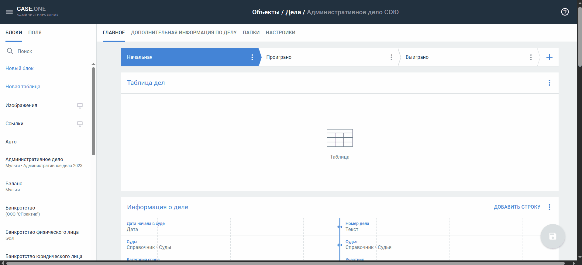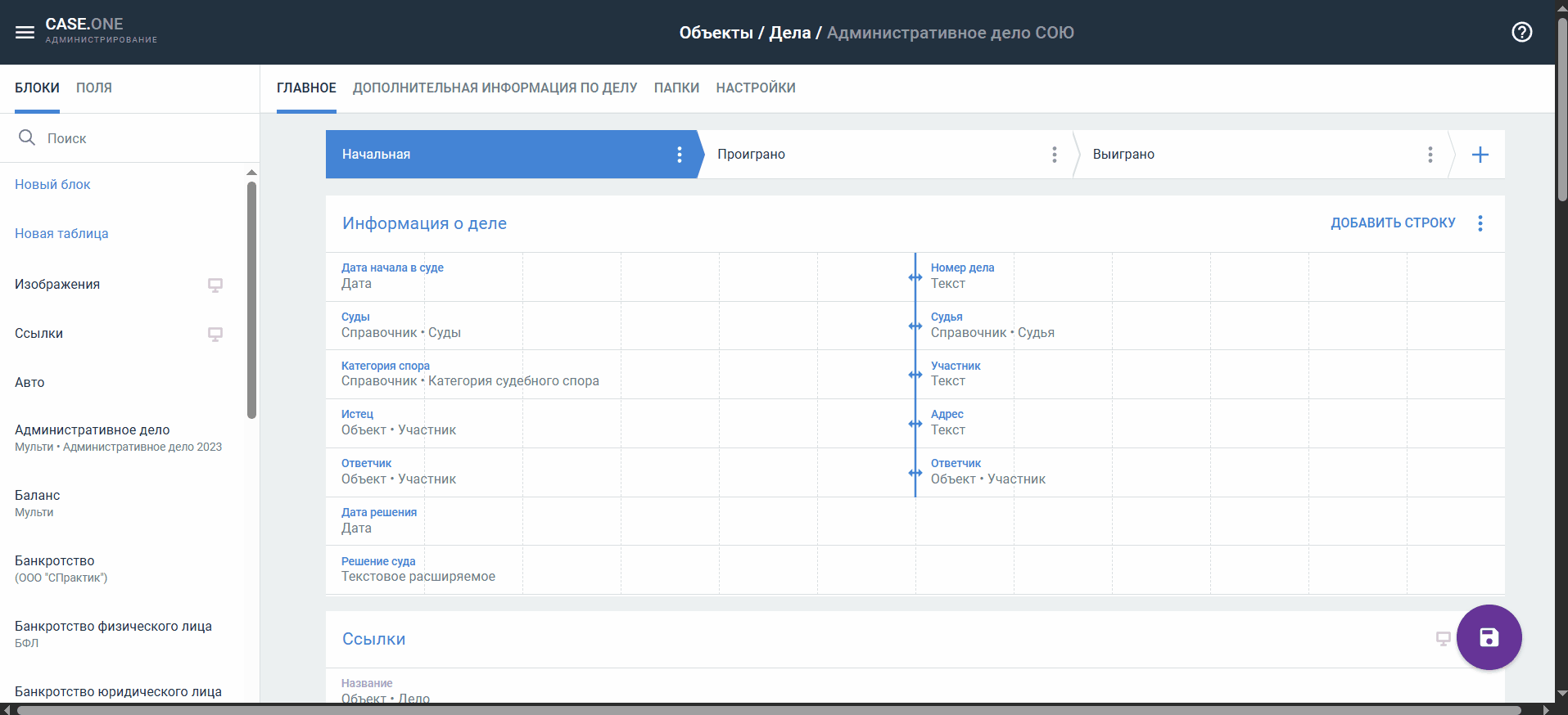 - Созданные поля с типом: Встраиваемый код, Данные, Кнопка, Разделитель, Сообщение, Объект-Документ, Объект-Пользователь, Шаблон номера дела
