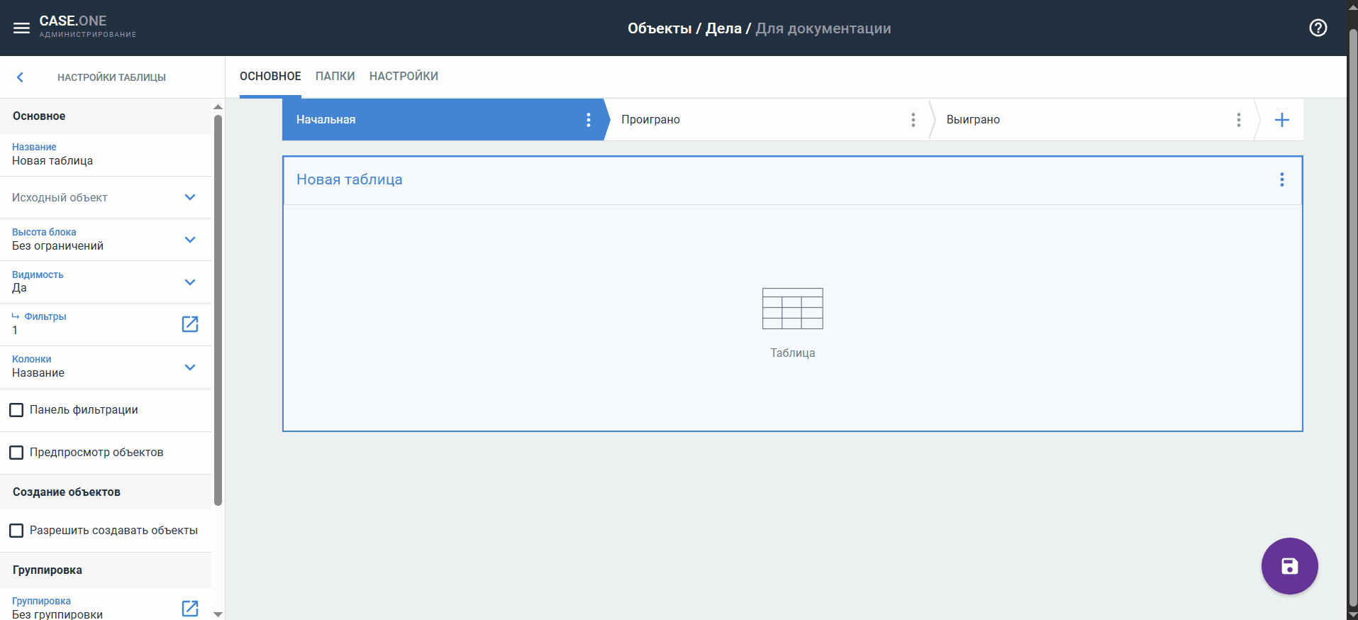 - Разрешить создавать объекты — при установке флага (по умолчанию снят) пользователю будет доступно создавать новые карточки объектов при просмотре таблицы