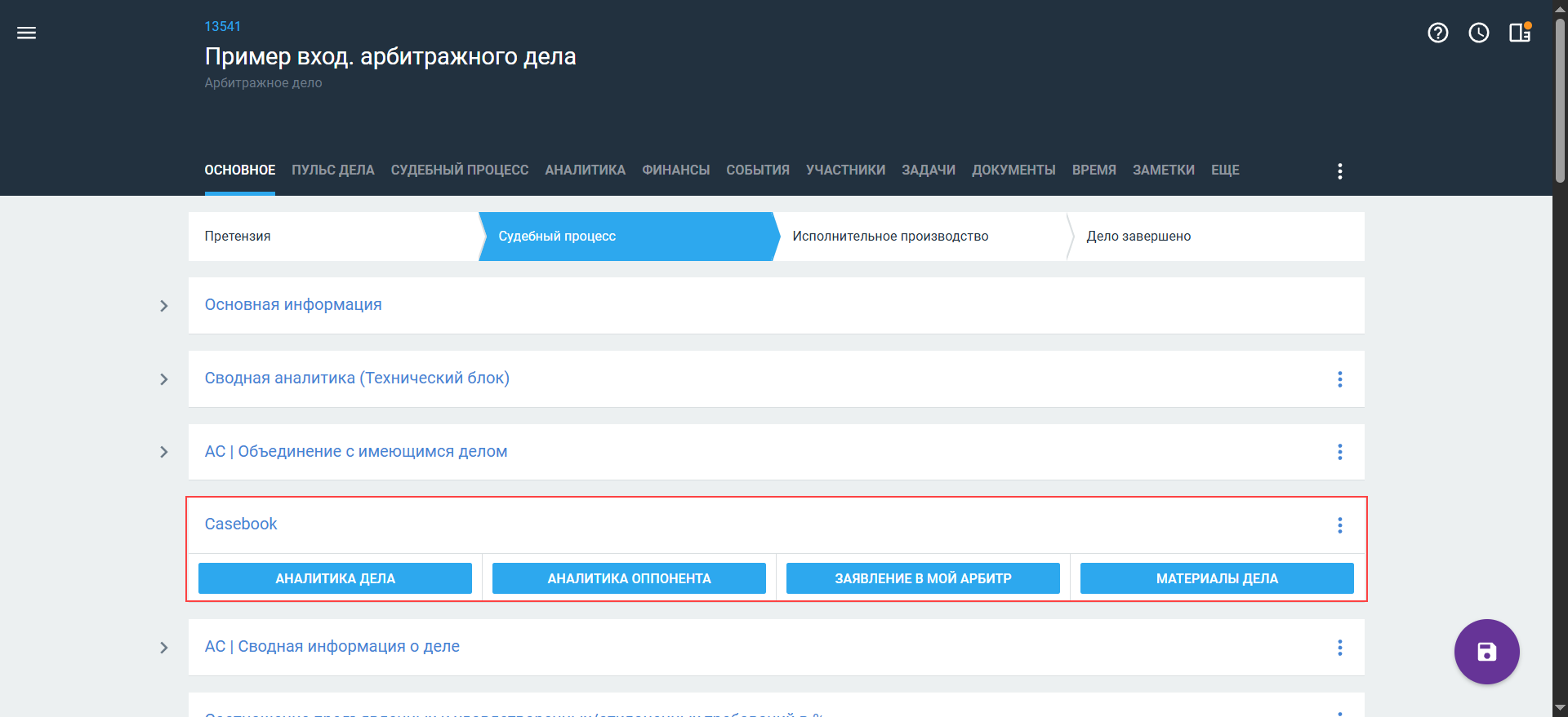 Детальное описание возможностей при работе с делами в Casebook вы можете посмотреть в статье Карточка дела Casebook Справочного центра.