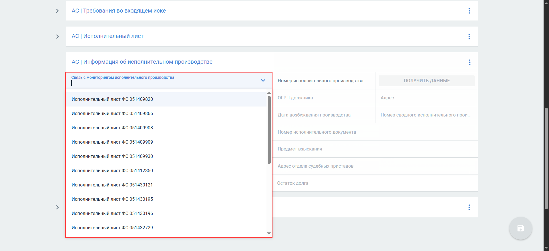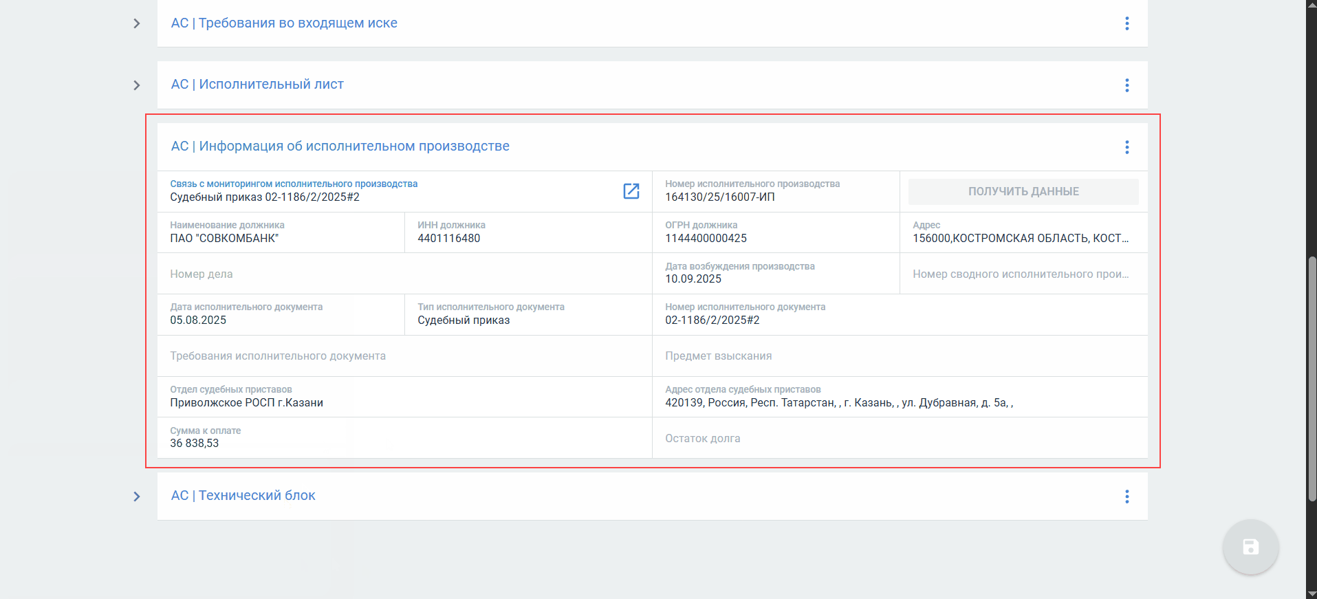 - Блок АС | Информация об исполнительном производстве — в блоке вы можете установить связь с исполнительным производством двумя способами: