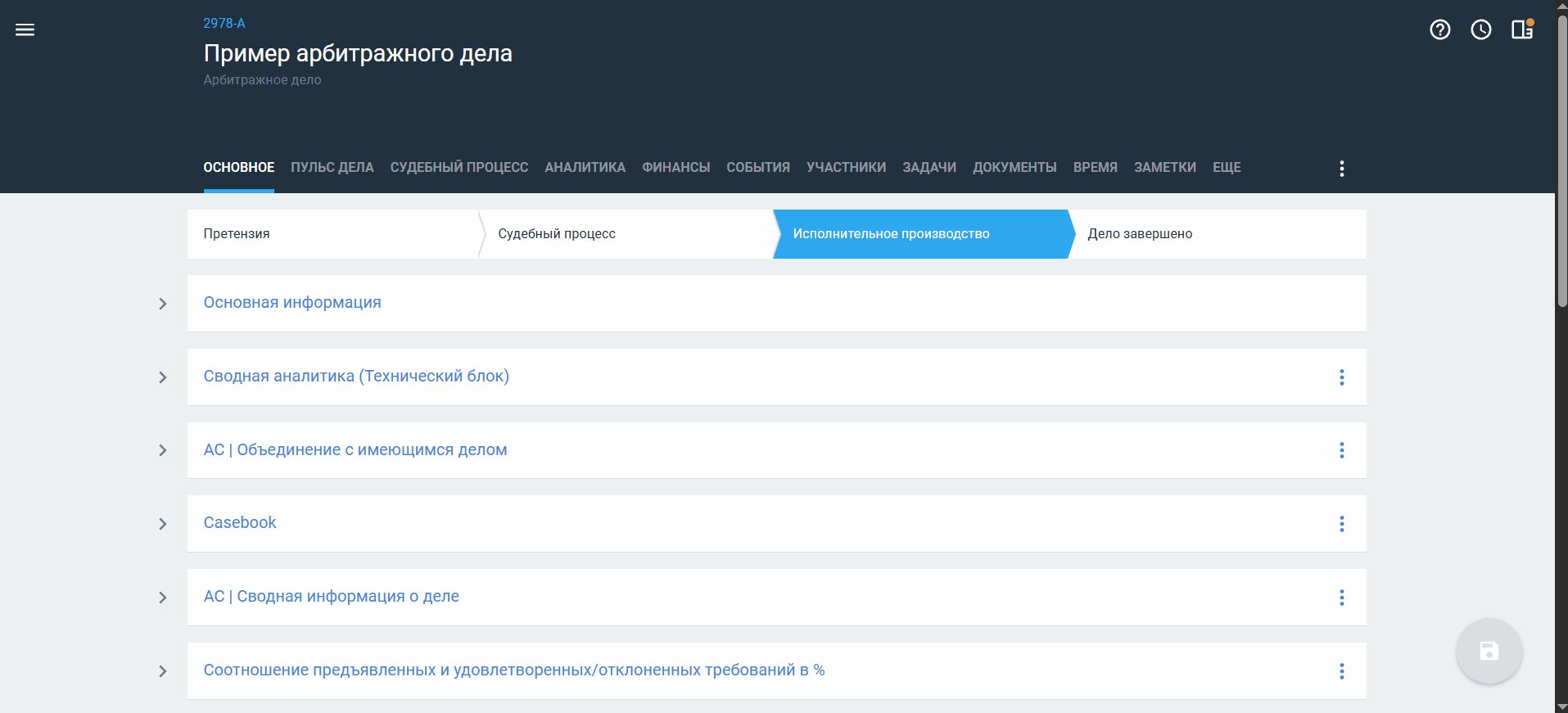 Общие блоки арбитражного дела на стадии Исполнительное производство содержат следующие поля: