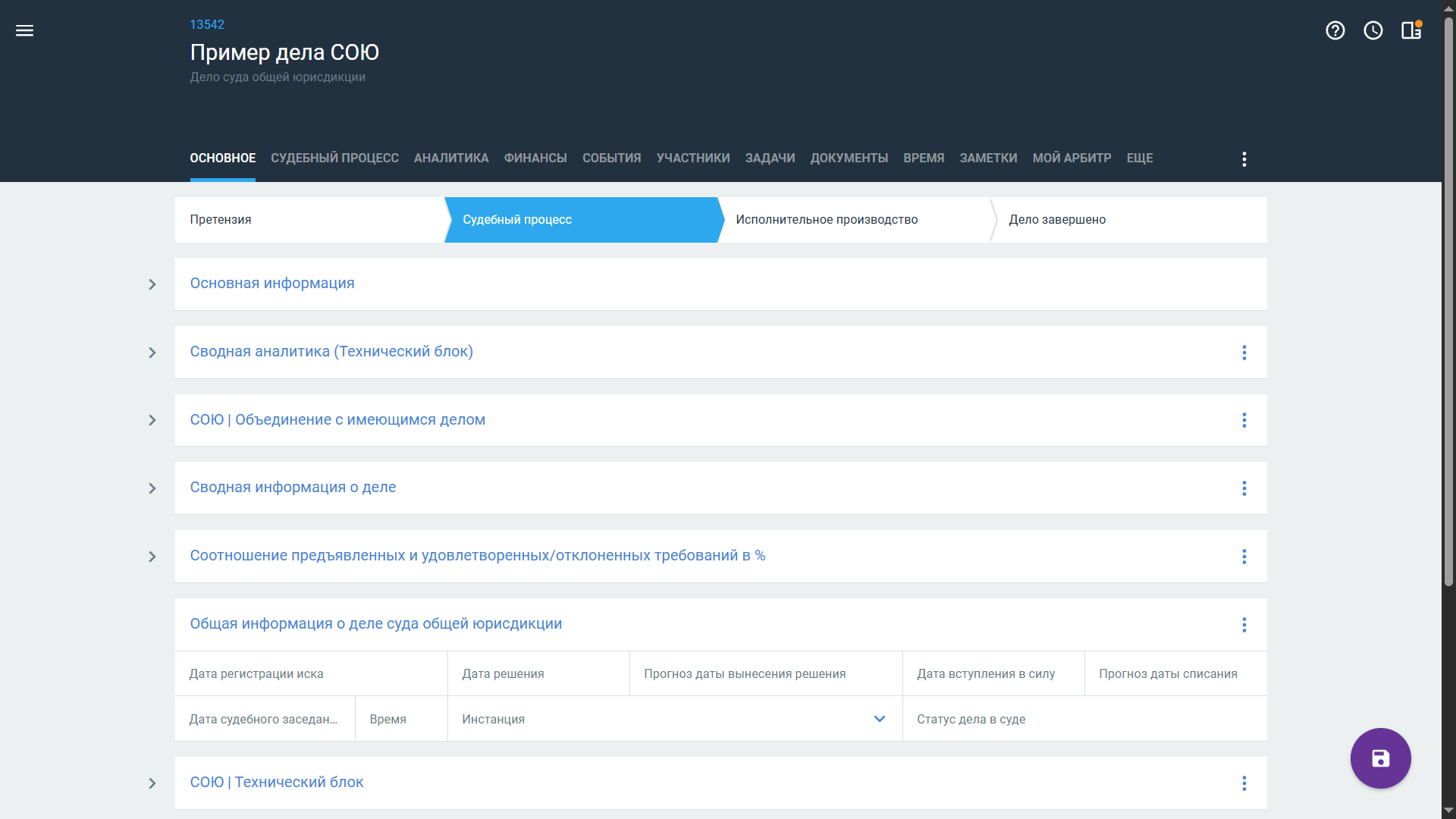 На стадии Судебный процесс, вне зависимости от типа дела по движению (входящее или исходящее), дополнительно отображается блок Общая информация о СОЮ.