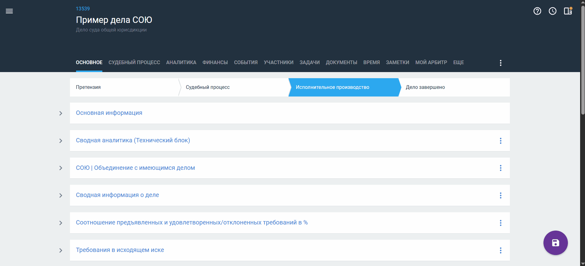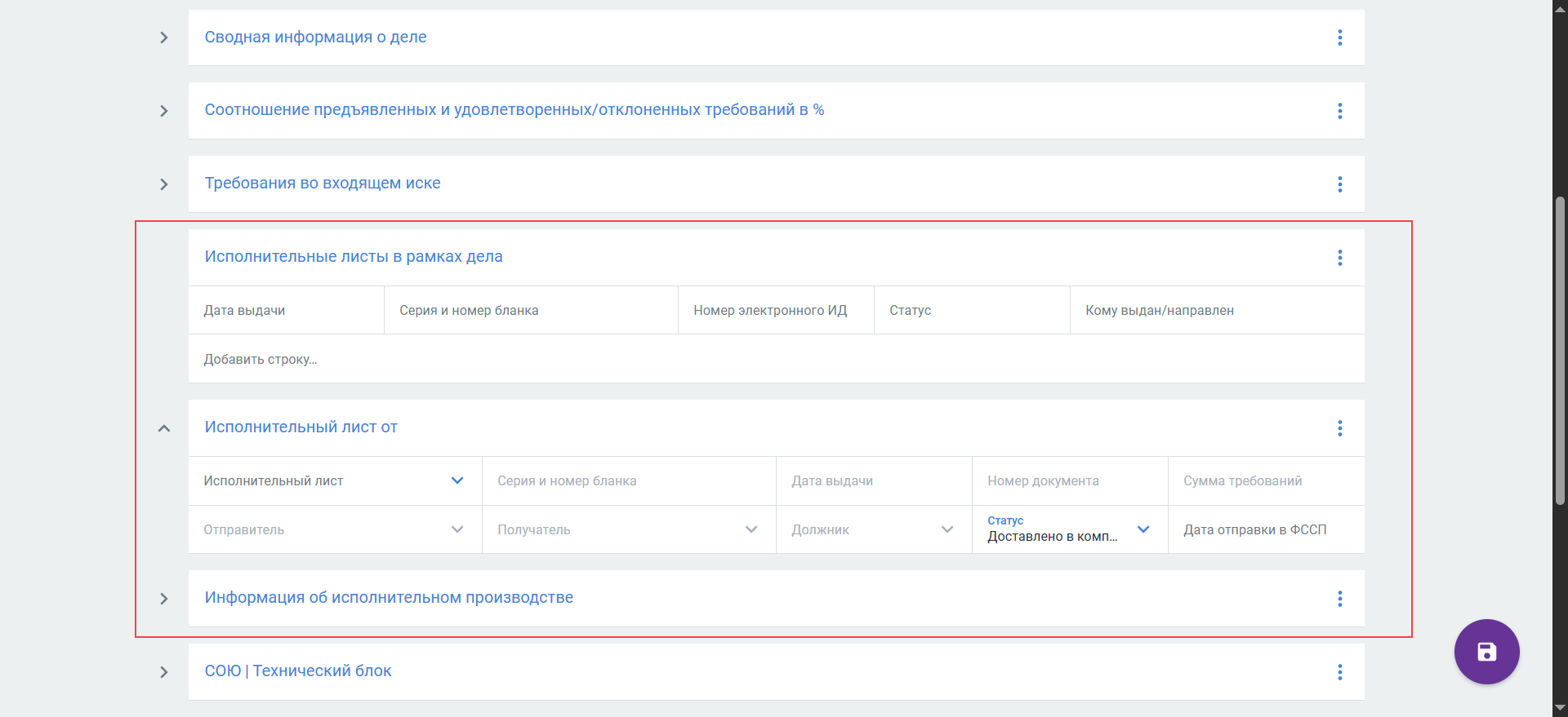 - Исполнительные листы в рамках дела. Блок не отображается на стадиях Претензия, Судебный процесс.