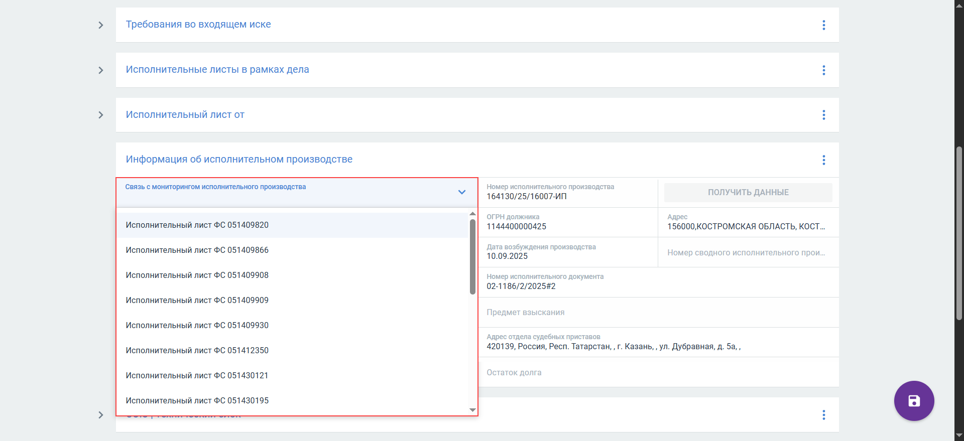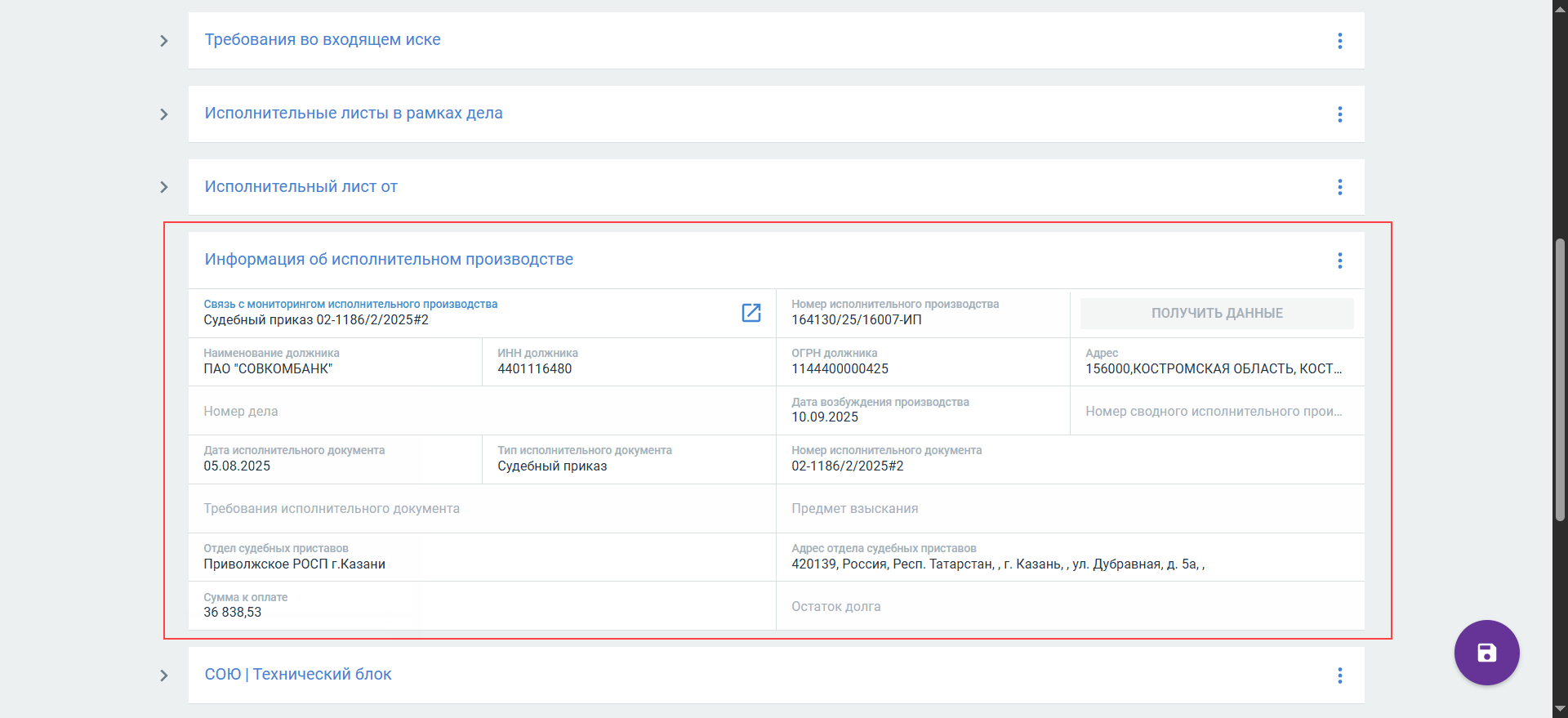В результате связи дела с исполнительным производством поля блока Информация об исполнительном производстве будут заполнены автоматически (недоступны для редактирования).