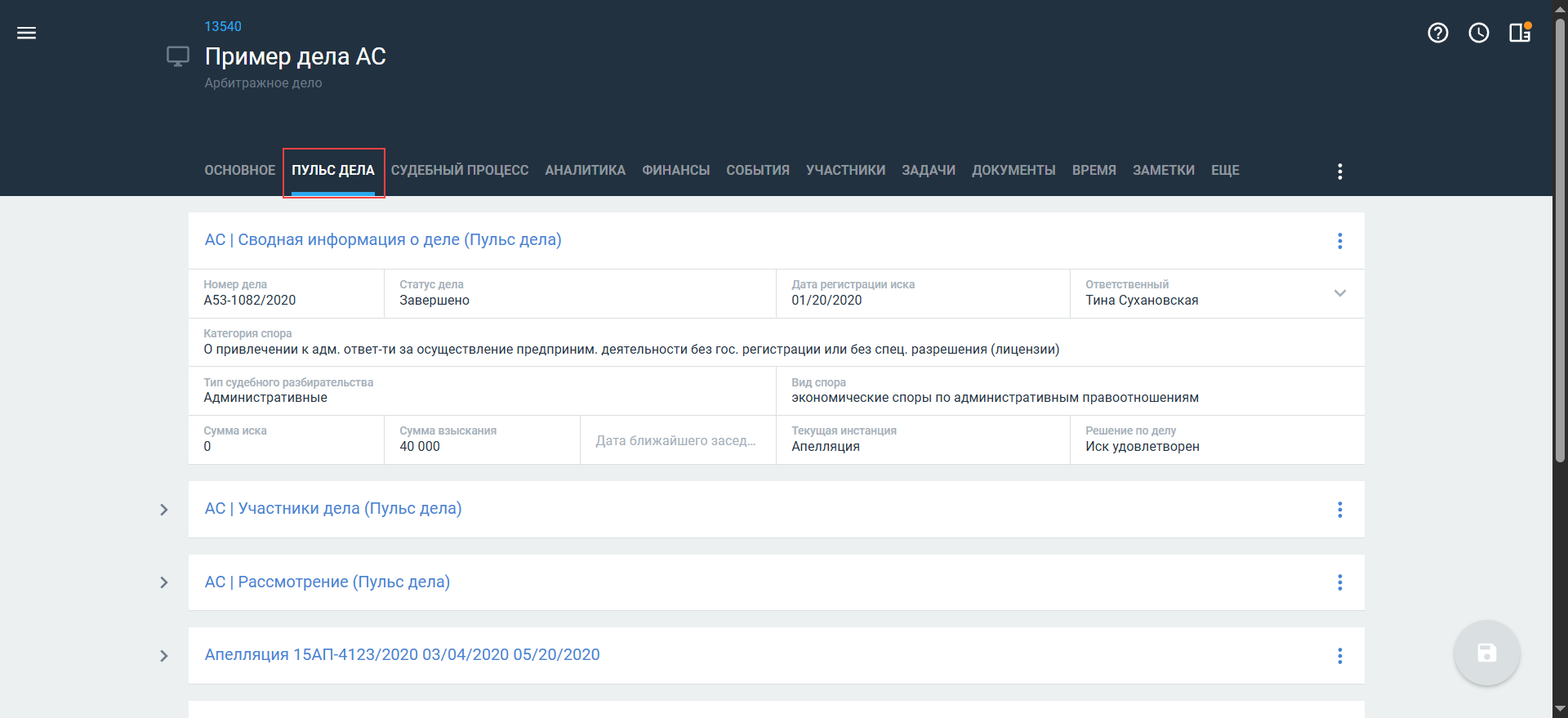 - Блок АС | Сводная информация о деле (Пульс дела):