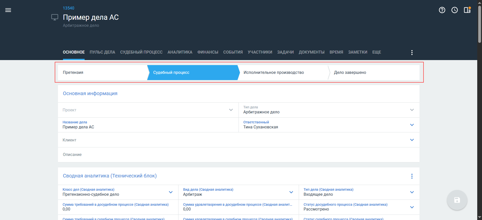 | Статус судебного процесса | Выбор значения из справочника Финальный статус дела: — В производстве — Не инициировано — Рассмотрено | Значения автоматически указываются в блоке Сводная аналитика. Используются для ведения отчетов, контроля данных дела и создания событий-уведомлений. Значение изменяется автоматически при изменении стадии дела: — Претензия — Не инициировано — Судебный процесс — В производстве — Исполнительное производство — Рассмотрено — Дело завершено — Рассмотрено (статус будет также изменен на Рассмотрено, если было указано значение В производстве). |