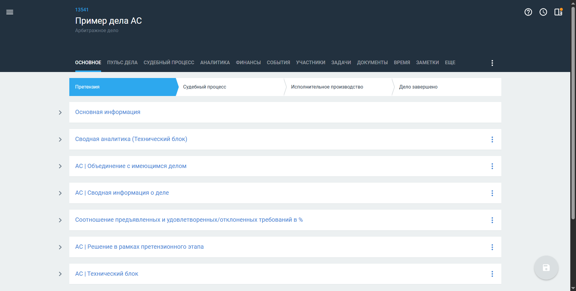 - Претензия — стадия дела по умолчанию после создания карточки. На стадии Претензия информация о деле может быть заполнена вручную или автоматически, если вы установили связь: