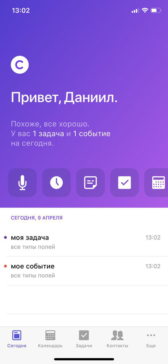 В разделе Сегодня отображается список событий и задач на текущий день.
