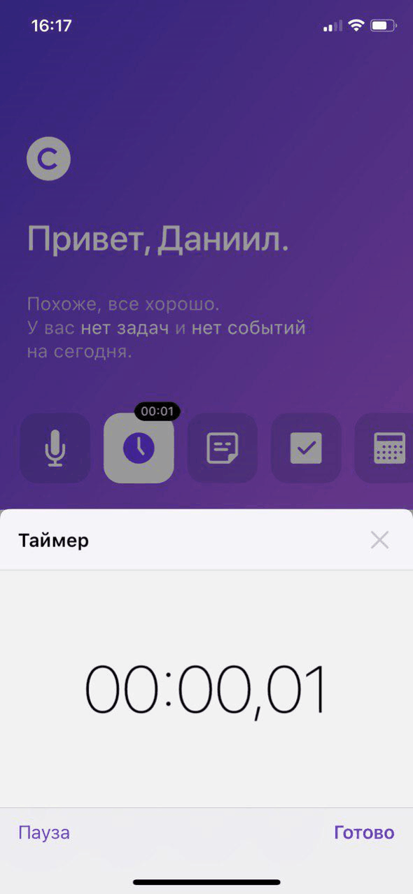 Для работы в приложении без остановки таймера нажмите на область вне окна таймера. Окно будет свернуто, время таймера отобразится на кнопке