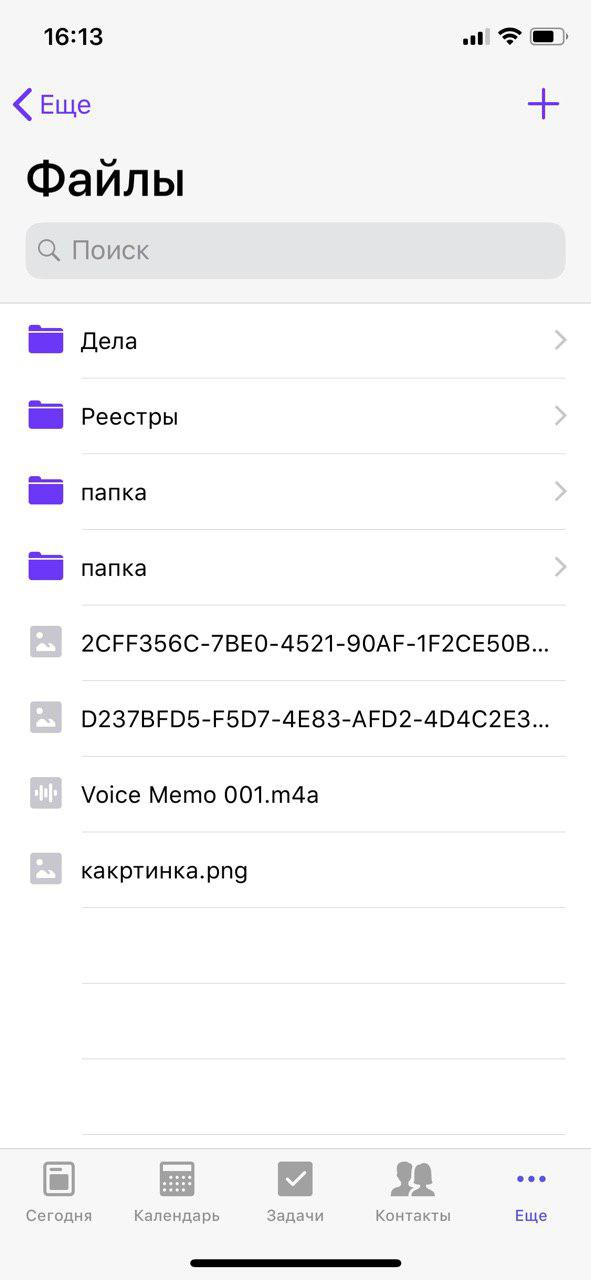 Чтобы посмотреть список документов, нажмите кнопку Еще в Главном меню и выберите пункт Файлы.