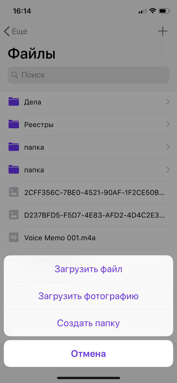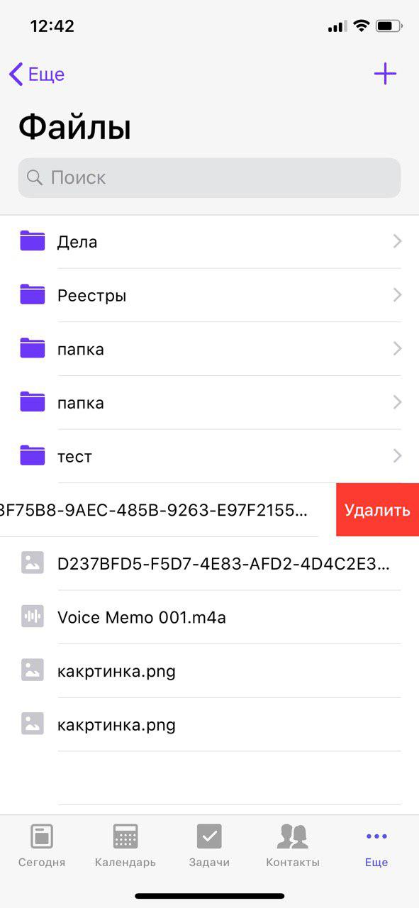 Все добавленные документы, фото и голосовые записи отображаются в списке файлов.