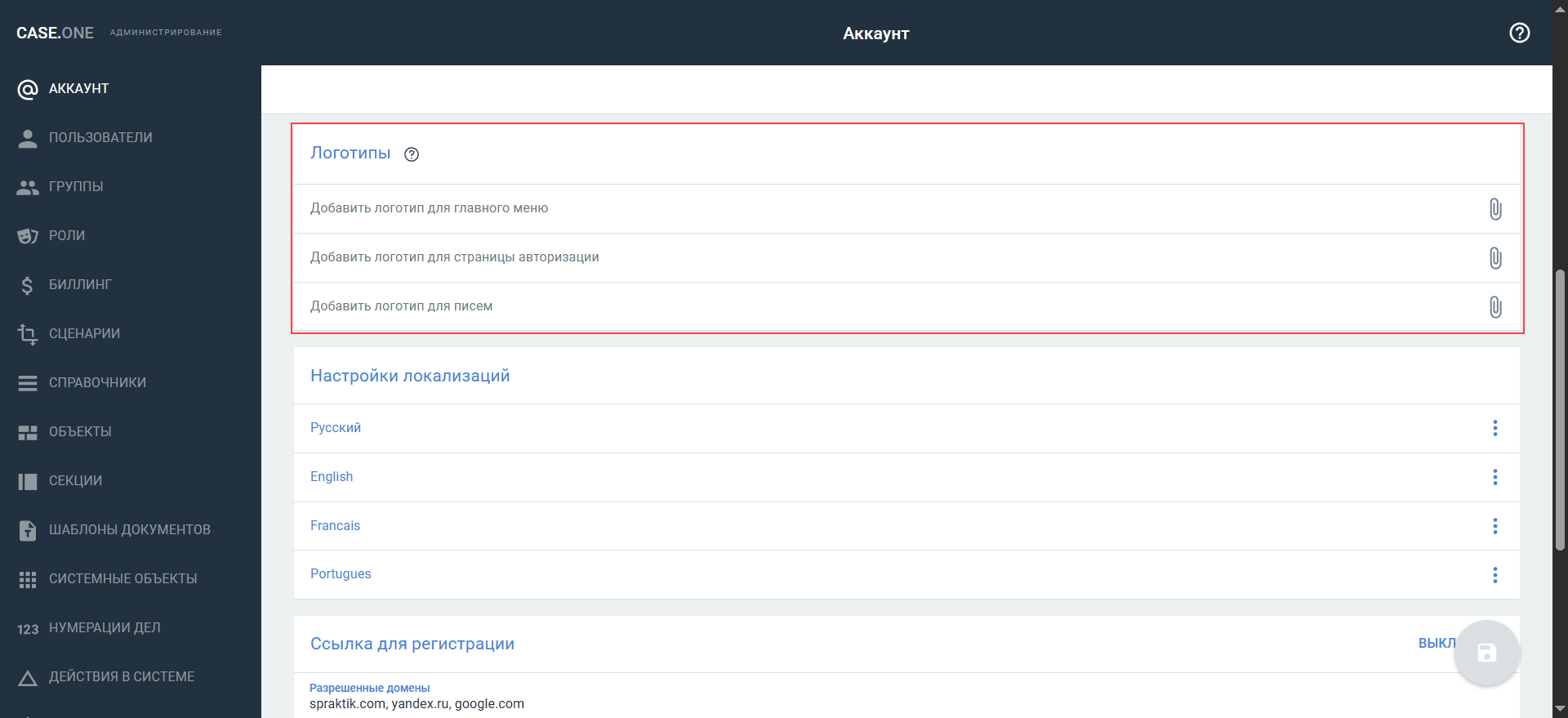 Вы можете адаптировать визуальное оформление Case.one под фирменный стиль компании в разделе Администрирование — Аккаунт, загрузив в блоке Логотипы файлы для: