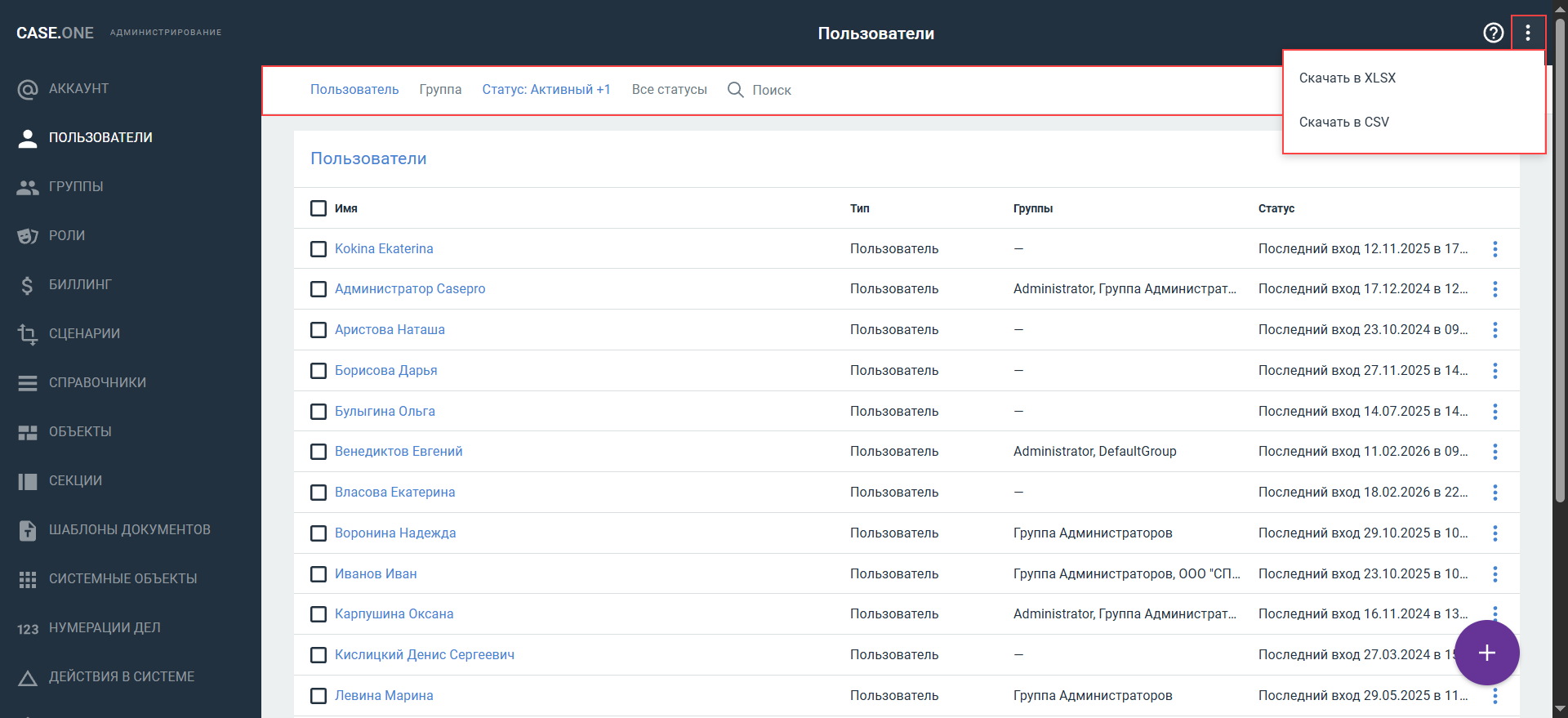 В любой момент вы можете выгрузить список пользователей, с учетом примененных фильтров, в формате CSV или XSLX.