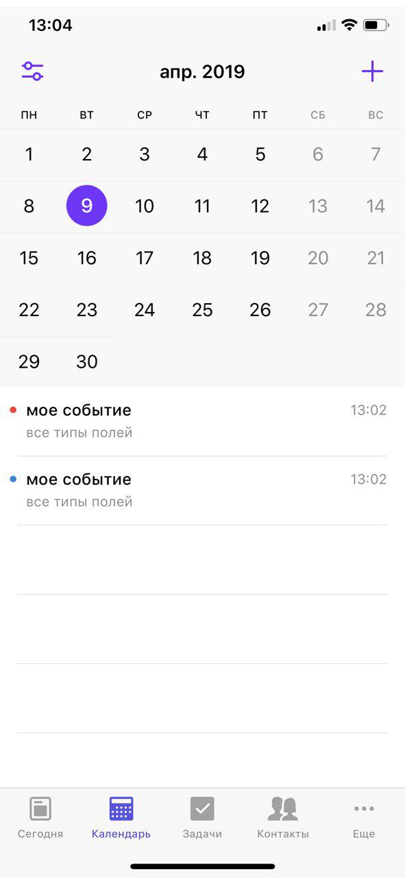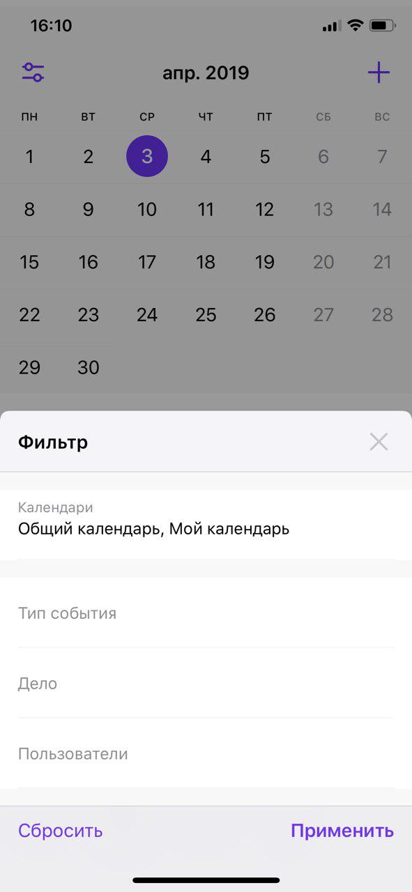 Также, как и в основной версии Case.one вы можете фильтровать записи, которые отображаются в календаре: