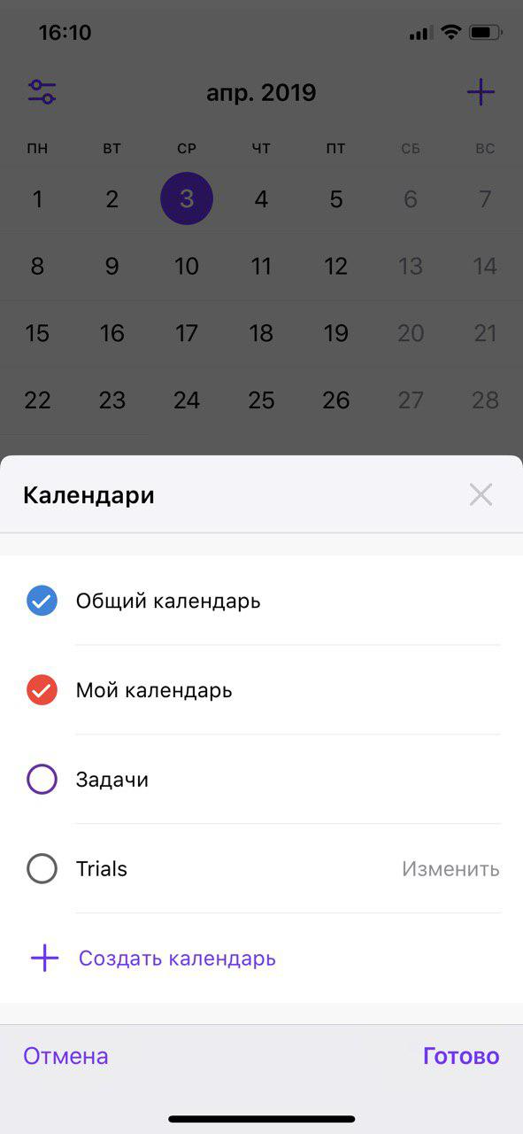 - Календари — для выбора календарей отметьте их флагами и нажмите кнопку Готово