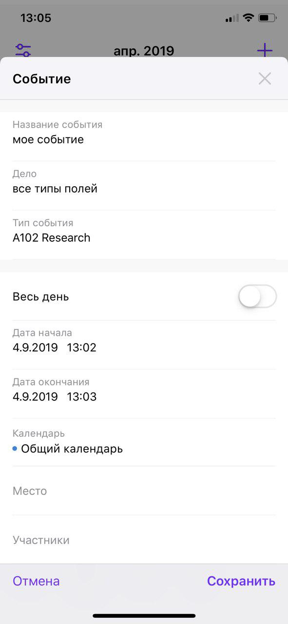 - Общий календарь, в котором доступны все события (при создании события в общем календаре, событие отображается для всех пользователи, которые наделены правами к делу события)