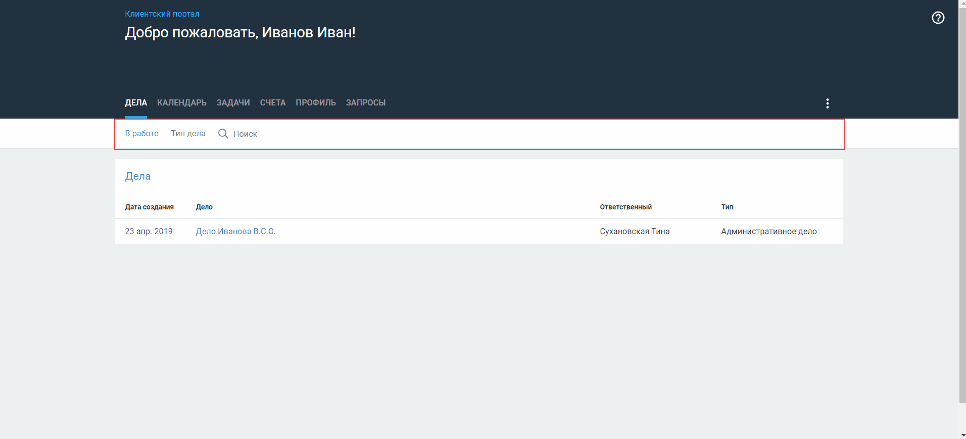 Чтобы быстро найти нужное дело, воспользуйтесь фильтрами по статусу дела (в работе или в архиве), по типу дела или строкой поиска.