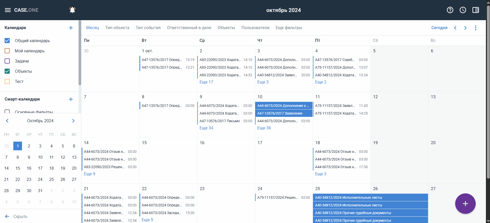 Общий календарь, в котором доступны все события в Case.one (при создании события в общем календаре, событие отображается для всех пользователей, которые наделены правами к делу события)