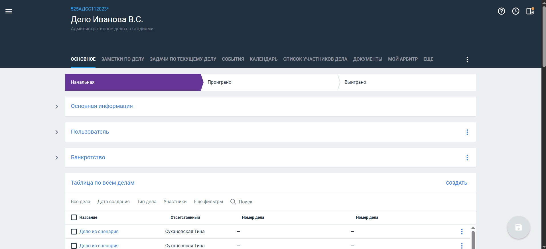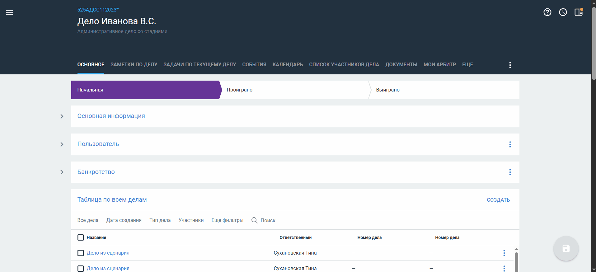 Основное — на вкладке содержится основная информация по объекту или делу: