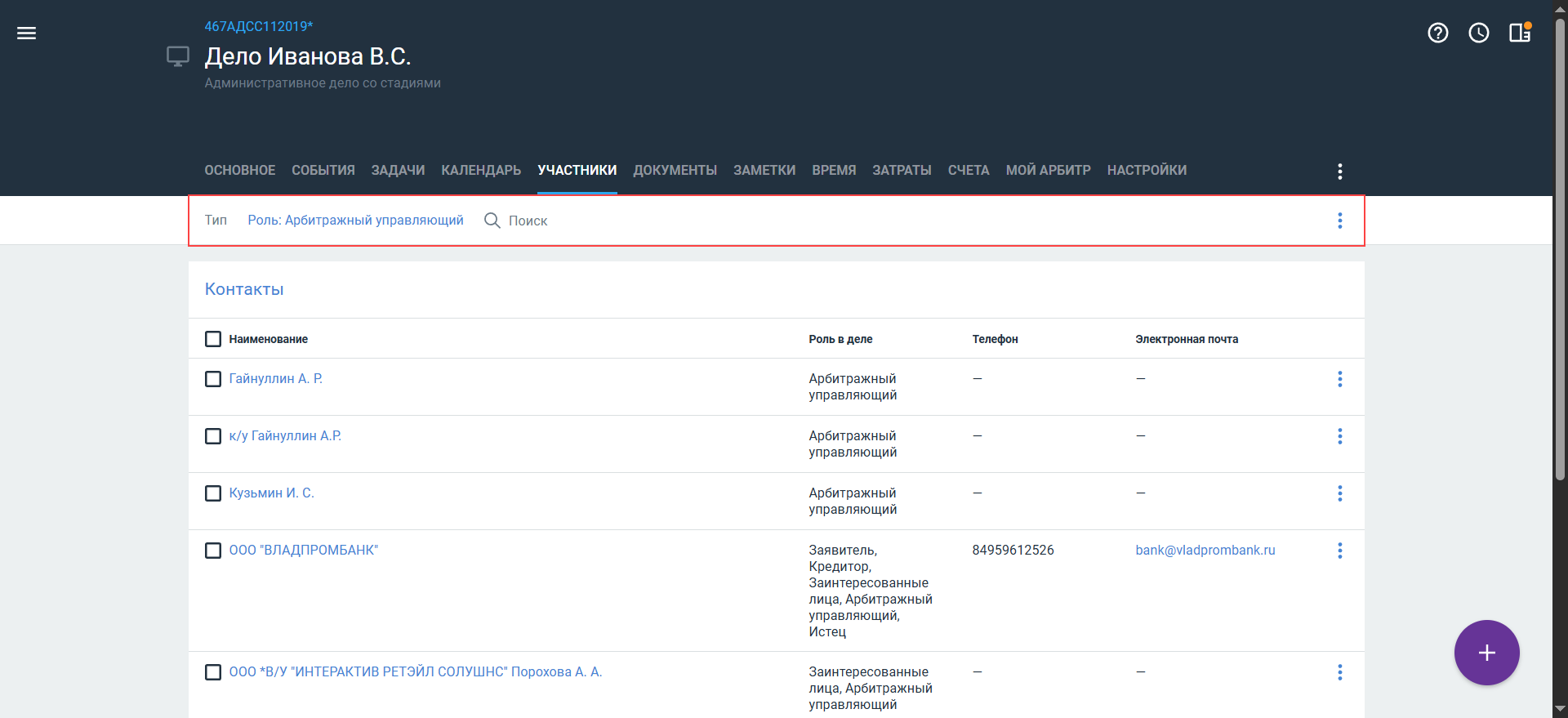 Роль — выбор значения из справочника Роль в деле, например: истец, ответчик, судья (значение по умолчанию — Все роли). При фильтрации списка участников по роли: