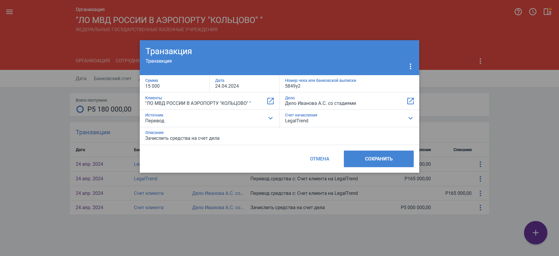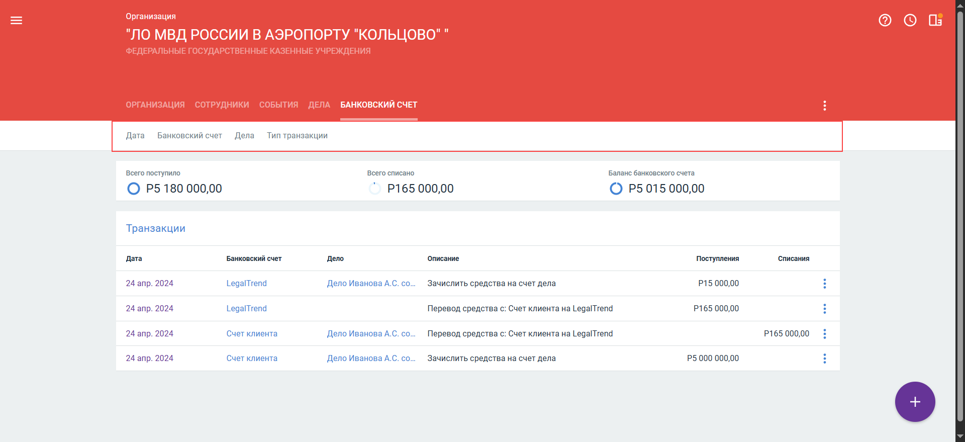 Дела — список дел, в которых фигурирует организация. По каждому делу отображается следующая информация: