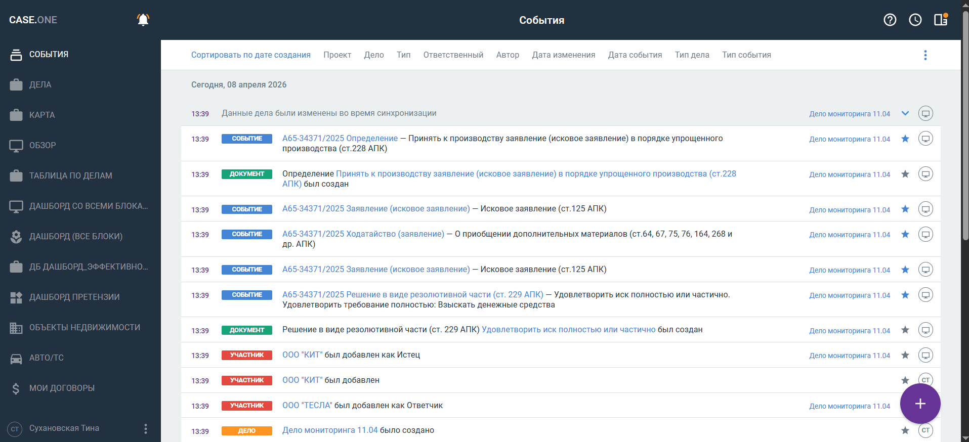 Также в карточке дела или объекта предусмотрена вкладка События, где отображаются все события исключительно по этому делу/объекту.
