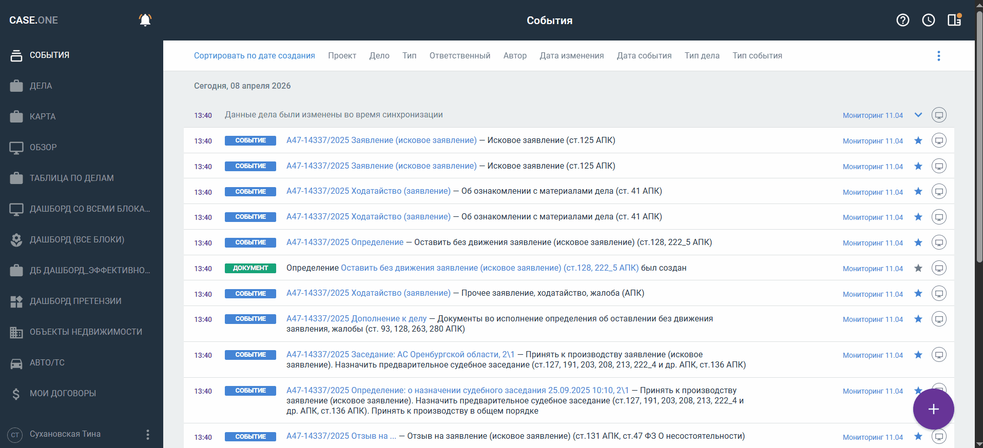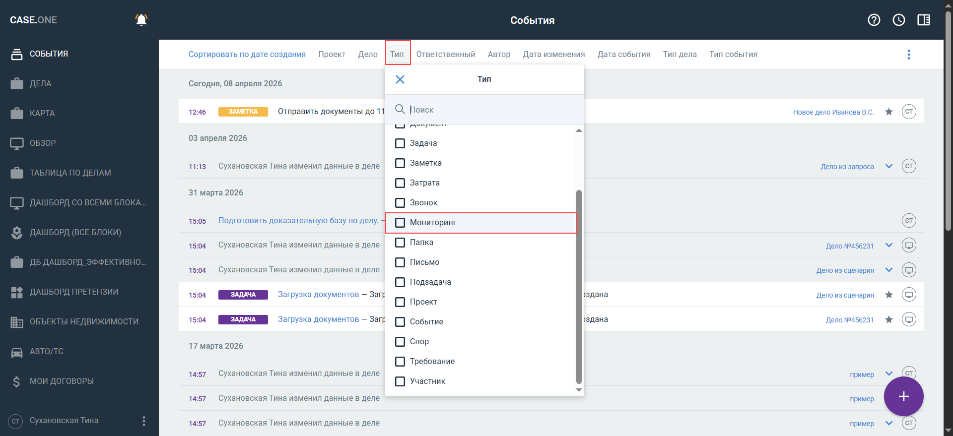 Отобразится список событий мониторинга, по которым были созданы дела в Case.one с соответствующими типами дел.