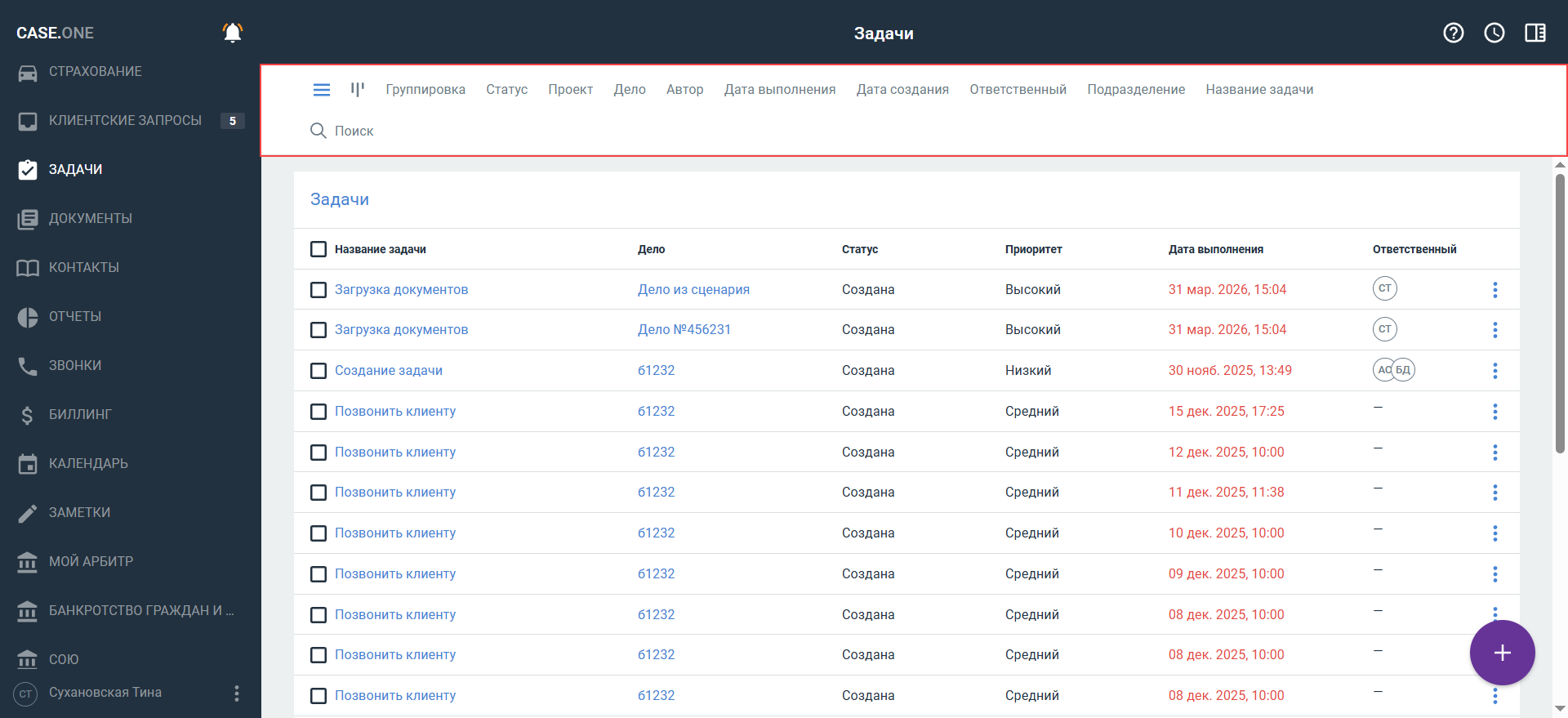 Иерархический вид списка задач предусмотрен для всех разделов Case.one, кроме Клиентского портала.