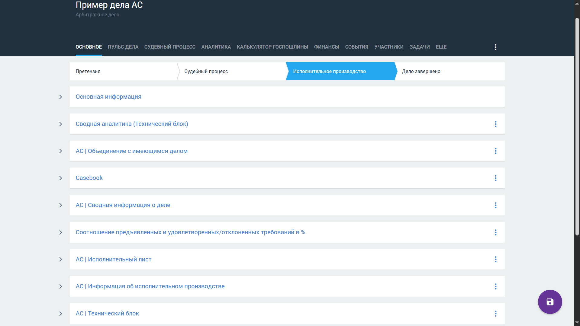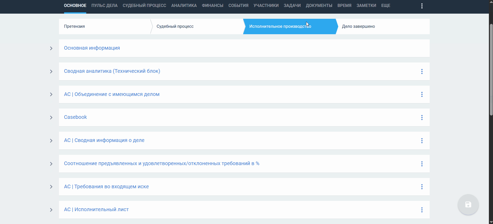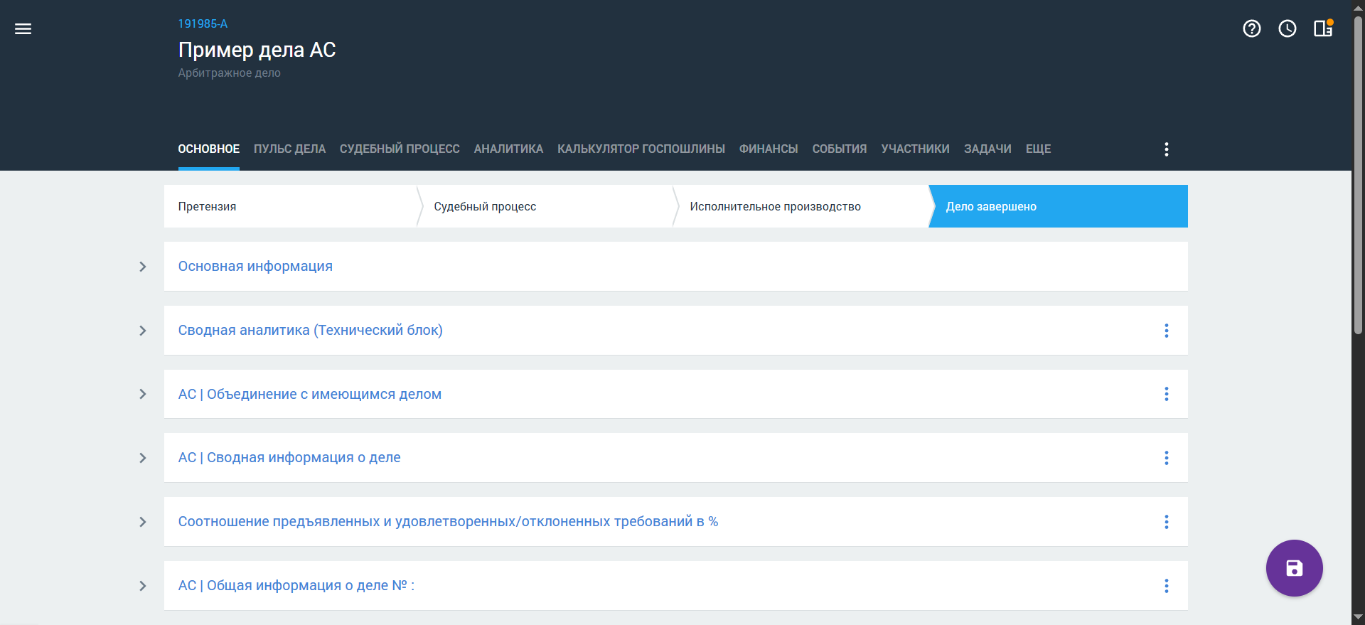 Стадия Дело завершено является финальной стадией при ведении карточки арбитражного дела. Если дело завершено, в карточке не отображаются дополнительные блоки для заполнения.