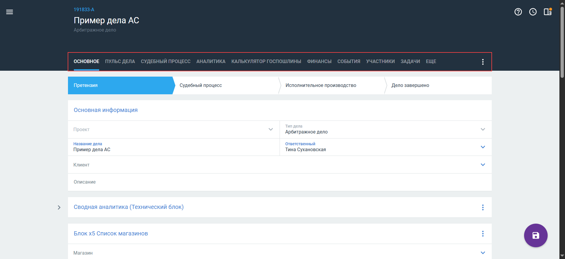 Значения автоматически указываются в блоке Сводная аналитика. Используются для ведения отчетов, контроля данных дела и создания событий-уведомлений. Значение изменяется автоматически при изменении стадии дела: — Претензия — Не инициировано — Судебный процесс — Не инициировано — Исполнительное производство — В производстве — Дело завершено — Рассмотрено (статус будет также изменен на Рассмотрено, если было указано значение В производстве)