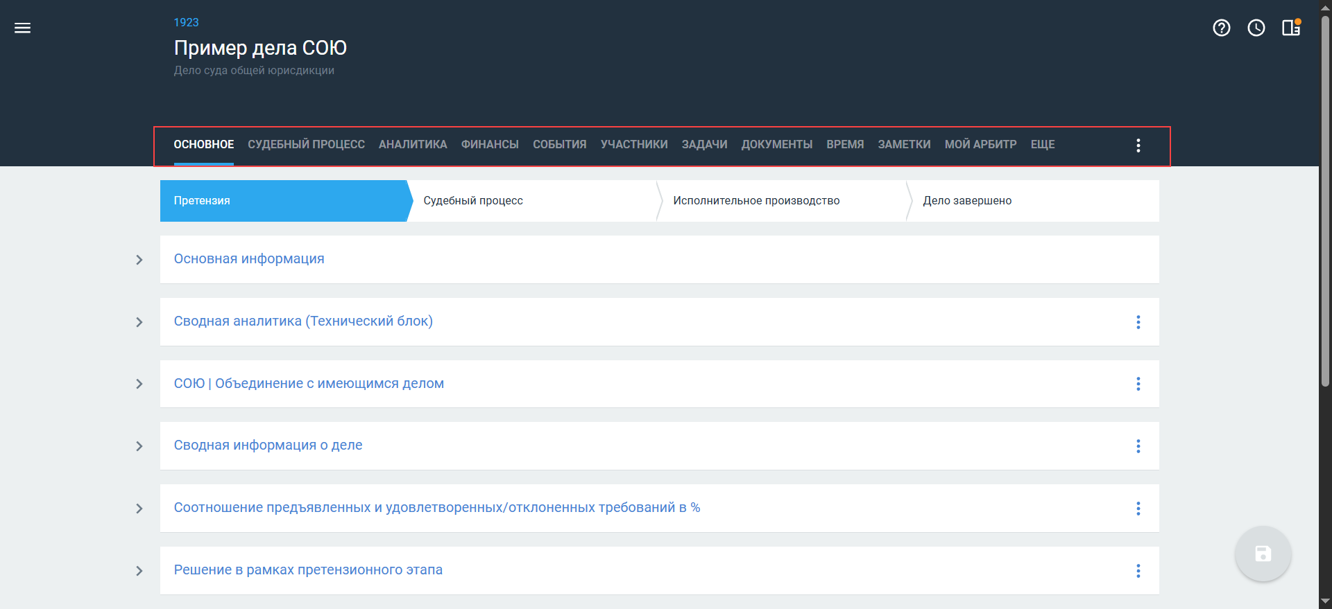 Вне зависимости от типа дела (арбитражное или СОЮ) информация в карточке дела распределена по следующим вкладкам: