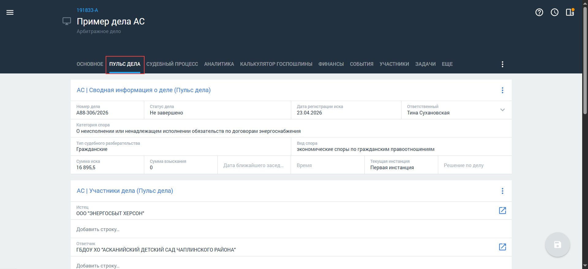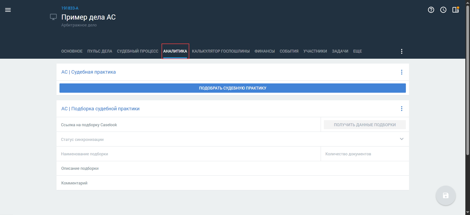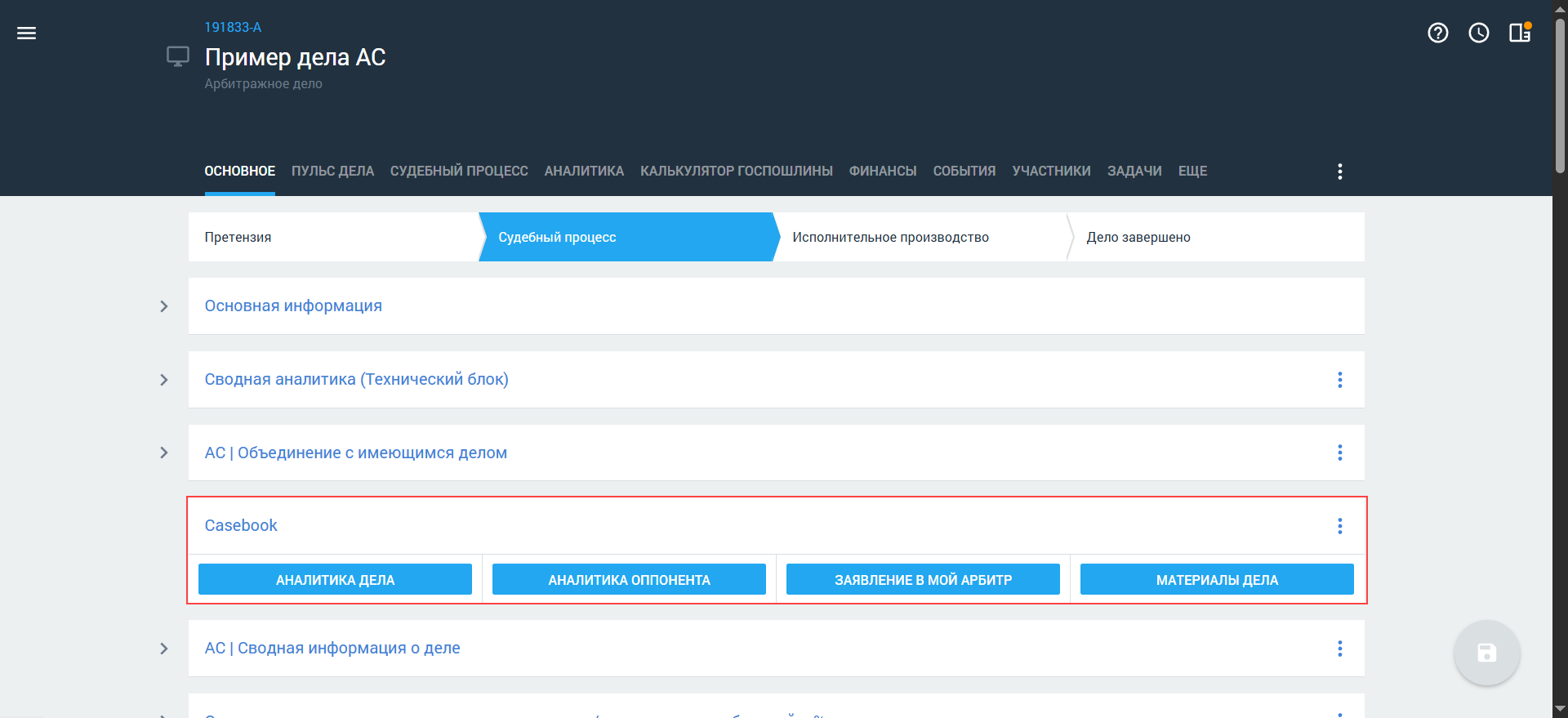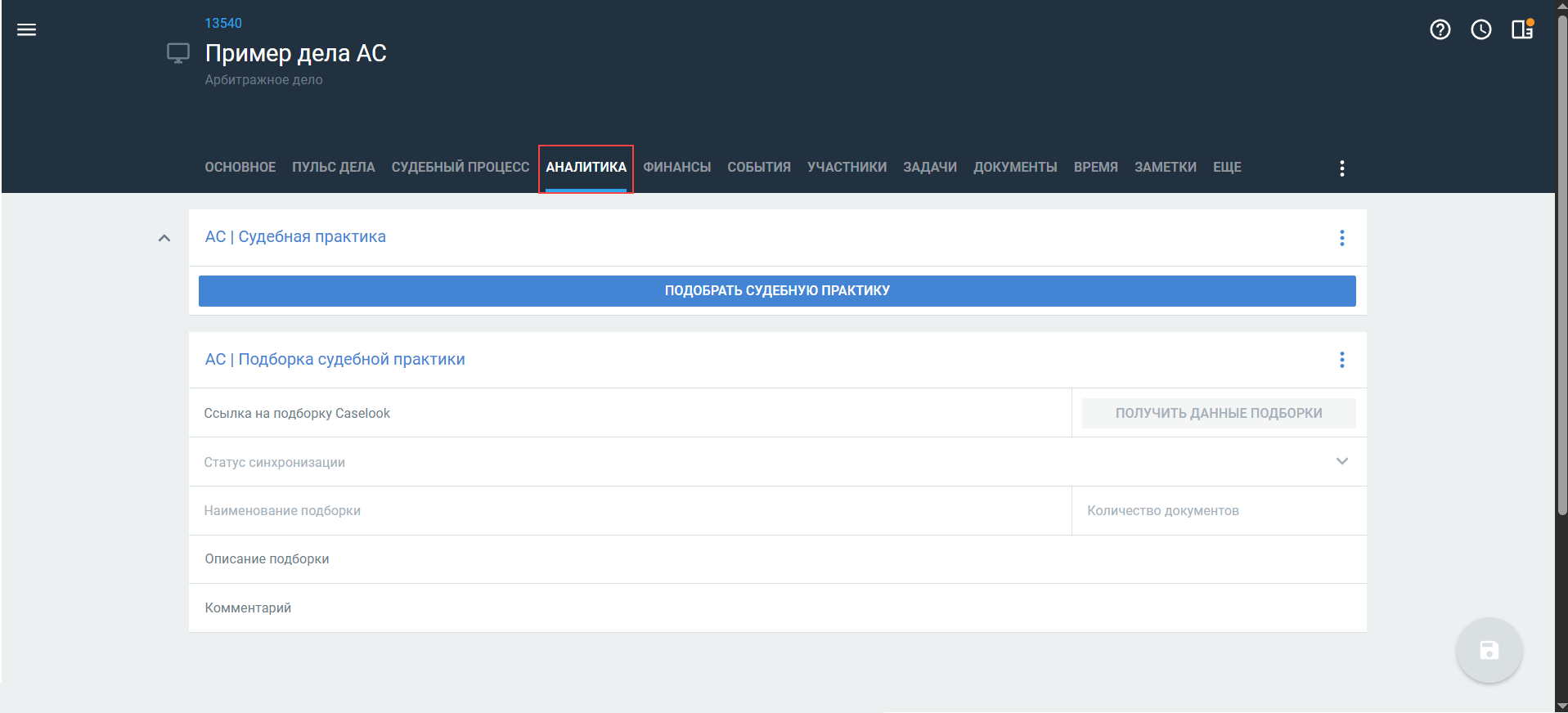 Чтобы сократить время на заполнение информации и регулярно получать обновления по делу, вы можете синхронизировать карточку арбитражного дела с КАД по номеру дела. После синхронизации все полученные данные (события, участники, задачи, документы) будут автоматически распределены по соответствующим вкладкам и полям в карточке арбитражного дела — подробнее см. в статье Синхронизация дела с Casebook (КАД) нашего Справочного центра.