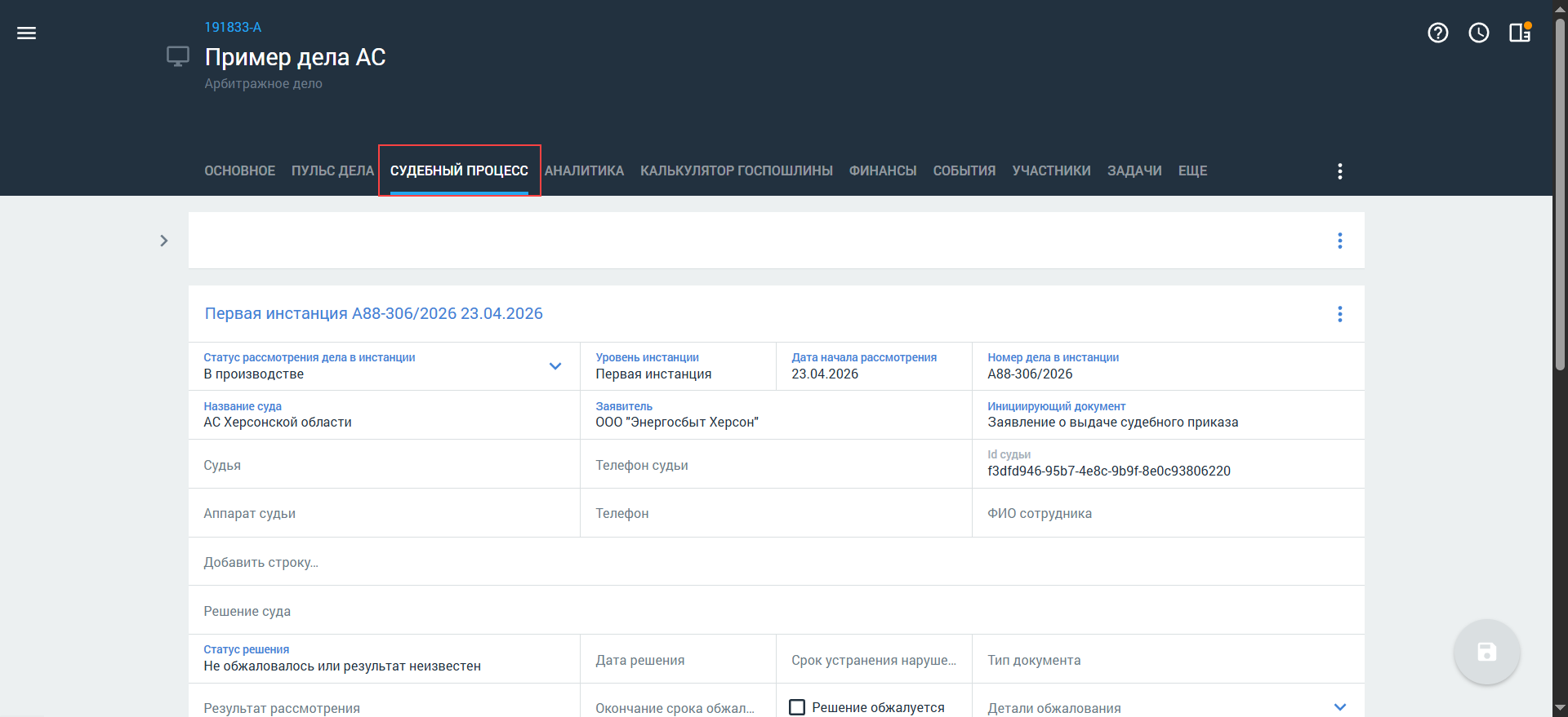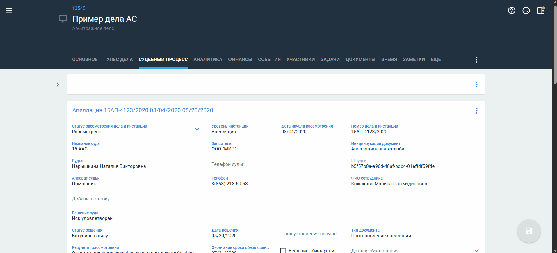 Судебный процесс — информация о деле может быть заполнена вручную или автоматически, если вы: