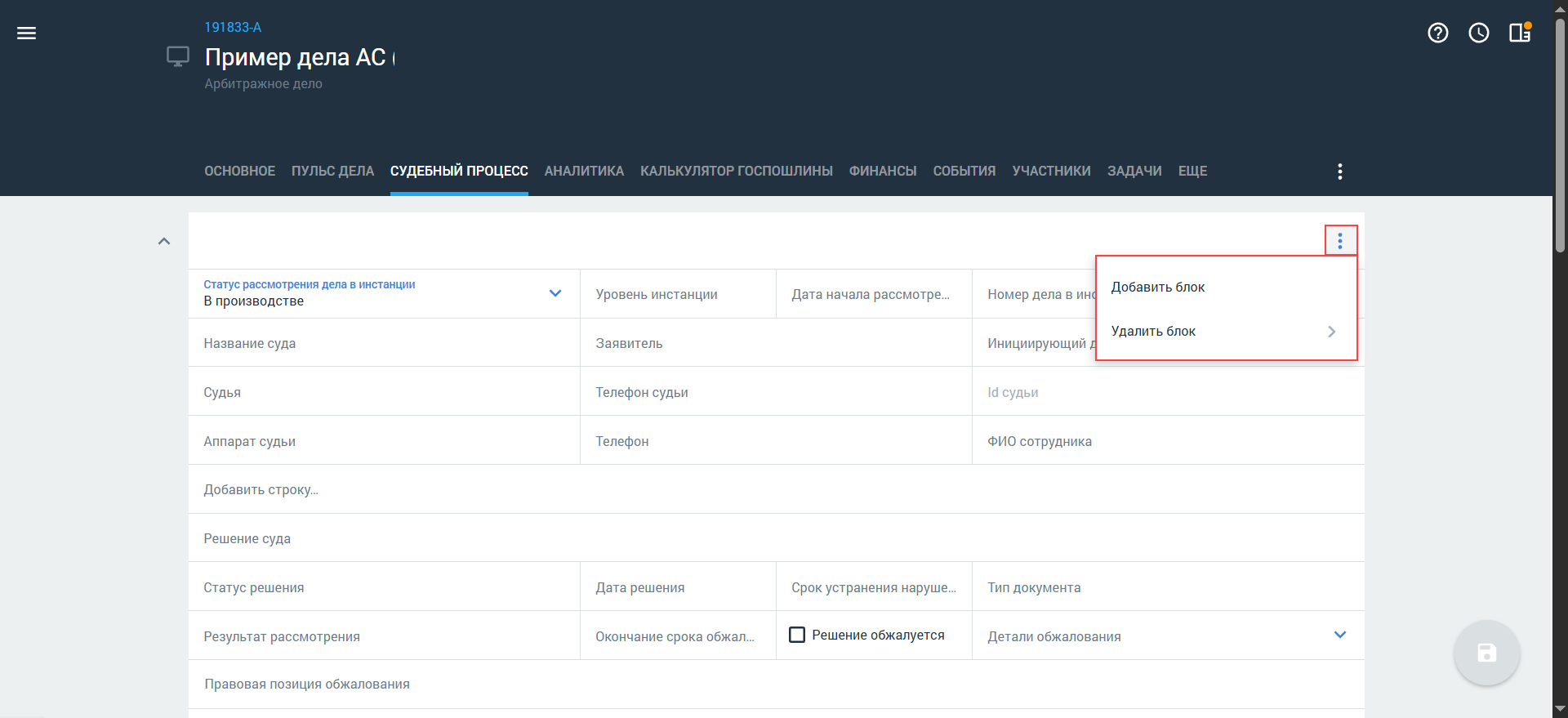 Вы можете добавить несколько блоков с информацией о судебном процессе при необходимости — нажмите кнопку и выберите пункт Добавить блок. Также блоки могут быть добавлены автоматически в результате синхронизации дела с КАД.